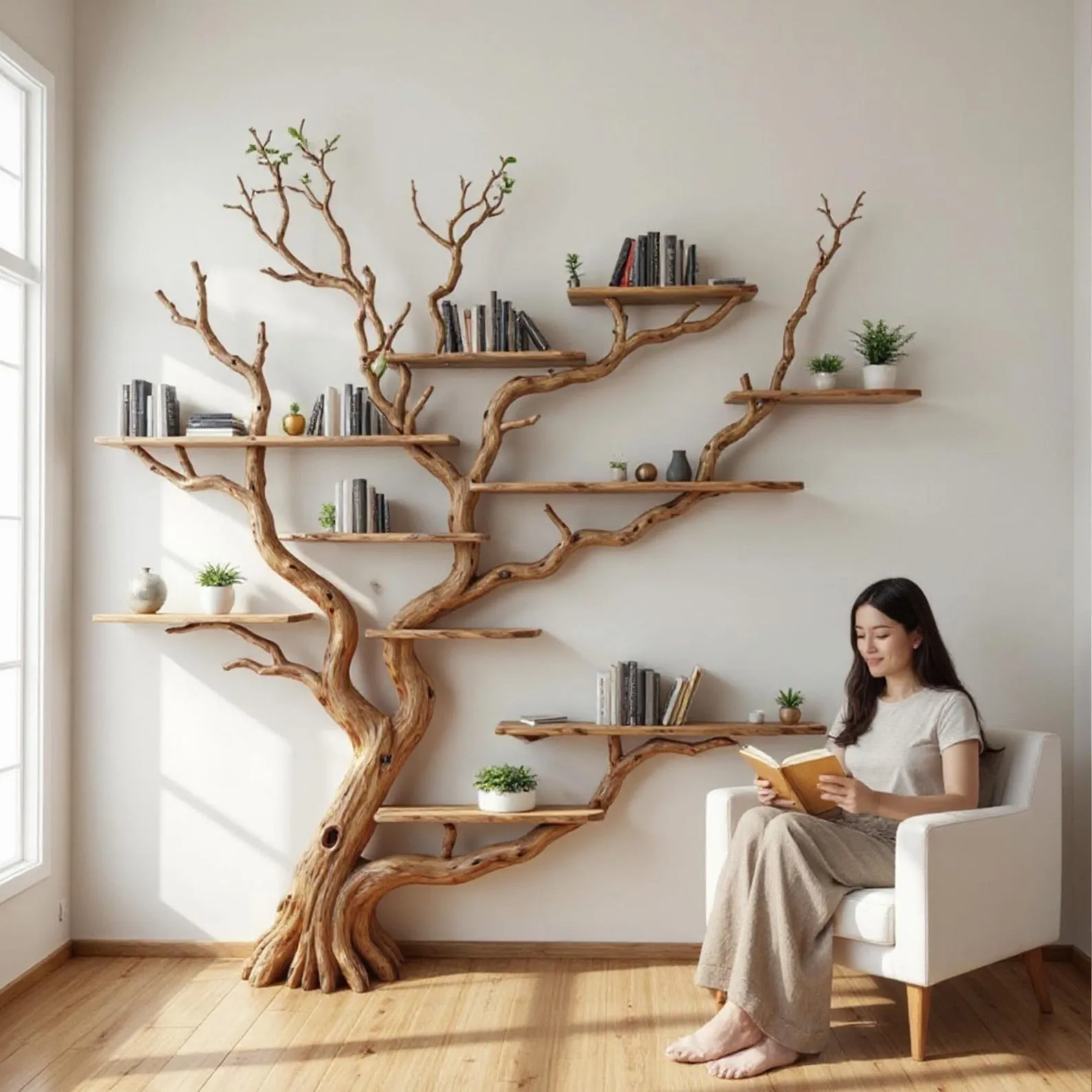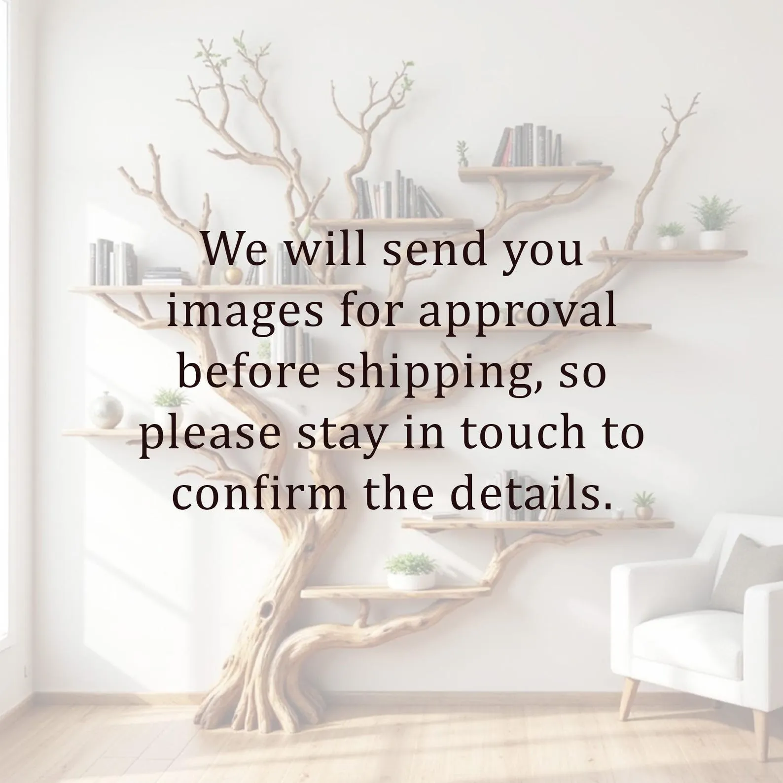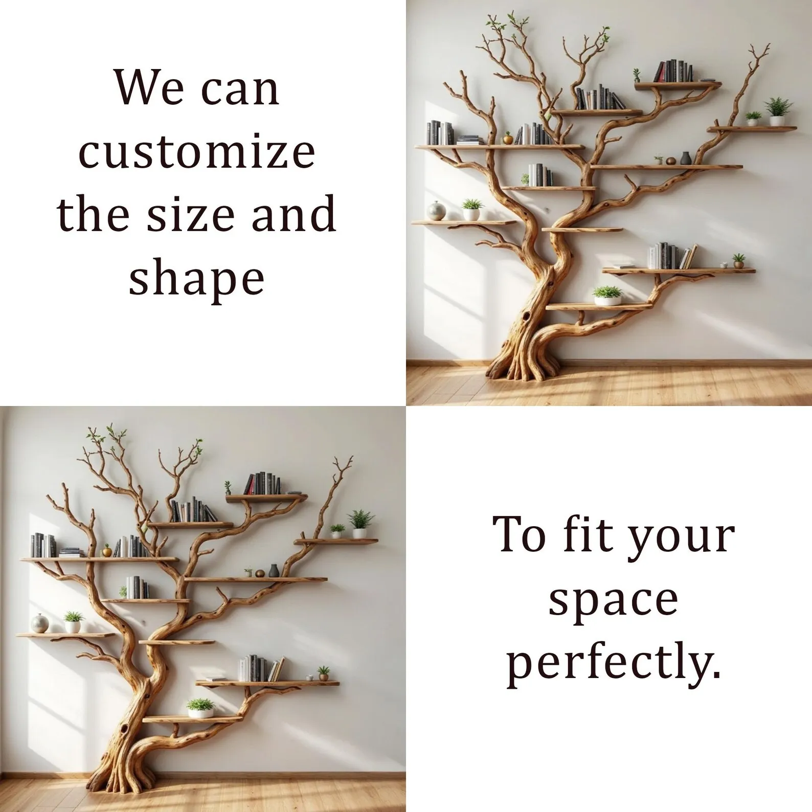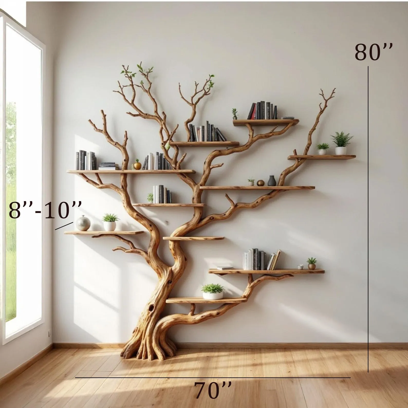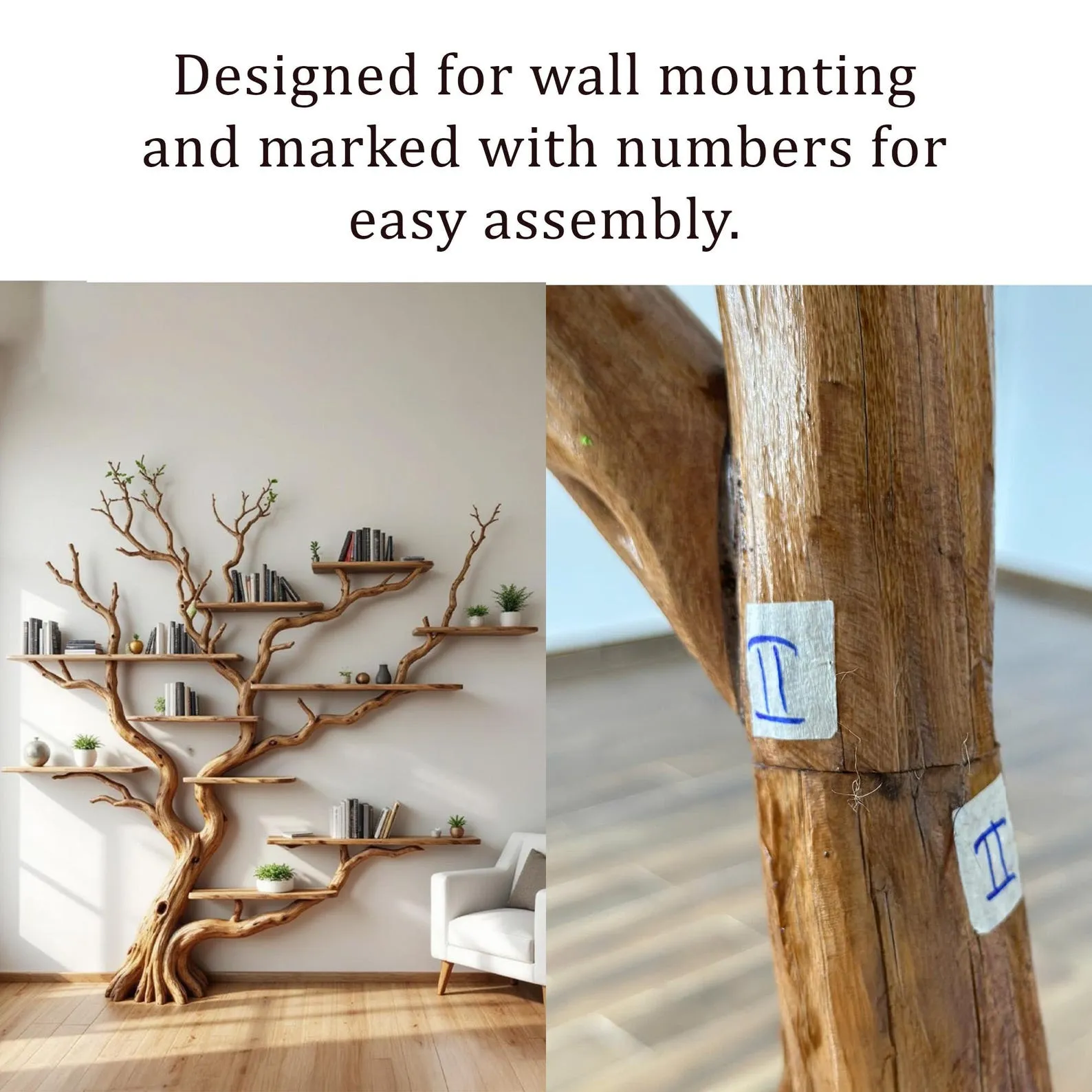 We carefully select driftwood branches from the high mountains of Vietnam to craft natural wood bookshelf like this. Each tree shelf wall art is handcarved by skilled artisans, highlighting the natural wood grain and distinctive organic curves. Because of this meticulous craftsmanship, every tree shelf is truly one of a kind, bringing a rustic yet elegant accent to your home Decor.Customizable Size & Shape:We understand that every space is different. That’s why we offer customization options for the size and shape of the live edge shelves, ensuring a perfect fit for your room and style preferences.’Easy Wall Mounting & Assembly:Designed for convenient wall mounting, each part of the shelf is marked with numbers to simplify the assembly process. Whether you’re experienced with DIY projects or prefer a straightforward setup, you’ll find installation hassle-free.Natural Variation:As this wooden bookshelf for wall is made from natural driftwood, please allow a size variation of 3 to 5 inches. These variations add to the authentic charm and uniqueness of your piece, making it truly special.Approval Before Shipping:We want you to be completely satisfied with your purchase. Before shipping, we will send you detailed images of your specific tree branch bookshelf decor for your review and confirmation. Please stay in touch so we can make any adjustments needed and ensure the final product meets your expectations.This driftwood branch bookshelf is more than just functional storage ‘ it’s a natural work of art that enhances any corner or wall. Perfect for displaying books, plants, or decorative accents, it brings warmth, character, and the beauty of nature into your living space.