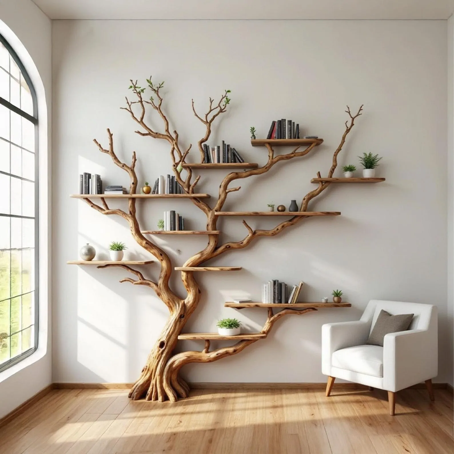 Solid wood tree bookshelf scupltured driftwood tree branch bookcase wall mount live edge bookshelf handcrafted living room decoration