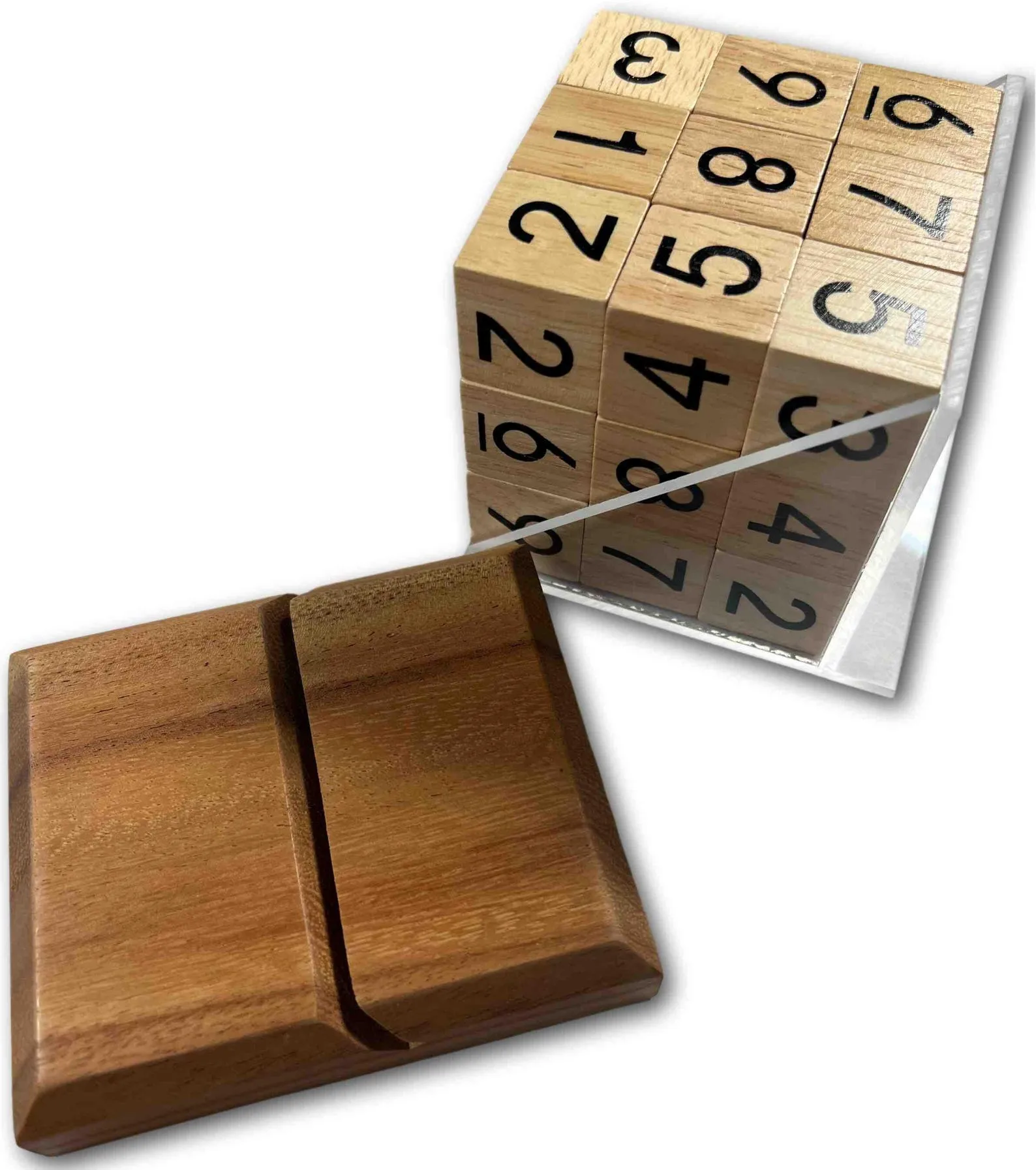 Premium quality puzzle with 27 precision ground blocks. Your goal is to make each face of the cube have the digits 1 through 9. This is quite difficult, a low level 5 (out of 5). It is achievable though as the indivudual blocks are only printed with a number on the outter faces. Comes with a beautiful wood and plexiglass base that allows for a nice presentation of the puzzle. Also comes with solution.If you would like to view a brief video explaining this wood puzzle please copy and paste the link below to your web browser.http://vzaar.tv/792996