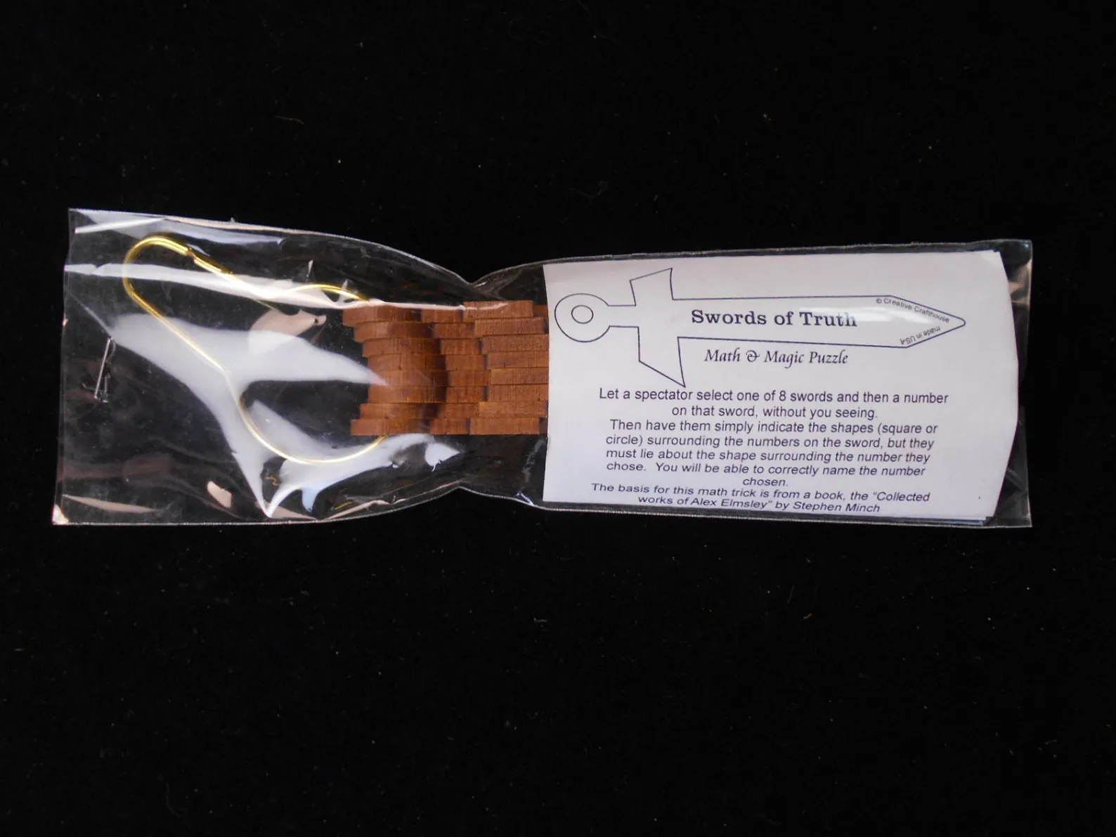 An astounding magic trick done with math. This is our design based on math magic from the book, the ?Collected works of Alex Elmsley? by Stephen Minch. The 8 different alder wood swords are very cool and give the trick a nice flare. Each sword has 6 different numbers on it. (48 different numbers in total are used by all swords). Each sword is about 5 1/2″ long and 1/4″ thick. They will come on strung on a chain for your convenience, or they can be easily separated as shown in the photo.Let a spectator select one of the swords and then a number on that sword, keeping that number a secret.You can even have up to 8 people select a sword at random. Then have them simply indicate the shapes (square or circle) surrounding the numbers on the sword, but they must lie about the shape surrounding the number they chose. At no time do they say aloud any numbers and at no time during the trick are you able to see the swords. Astonishingly, you will be able to correctly name the number(s) chosen. I will not reveal the details of the math secrets here, but as a hint, simple binary codes are established when they tell you the shapes and you will easily be able to determine the number. This is a GREAT fun item at gatherings. I think 12 yrs old and up can do this, and perhaps younger if a bit advanced for their age. It’s a good item for math teachers also, as it demonstrates in a fun way the use of binary math.Designed and made in Spring Hill, FLTo learn more about how this works please copy and paste the link below for a video on it!http://vzaar.tv/925817