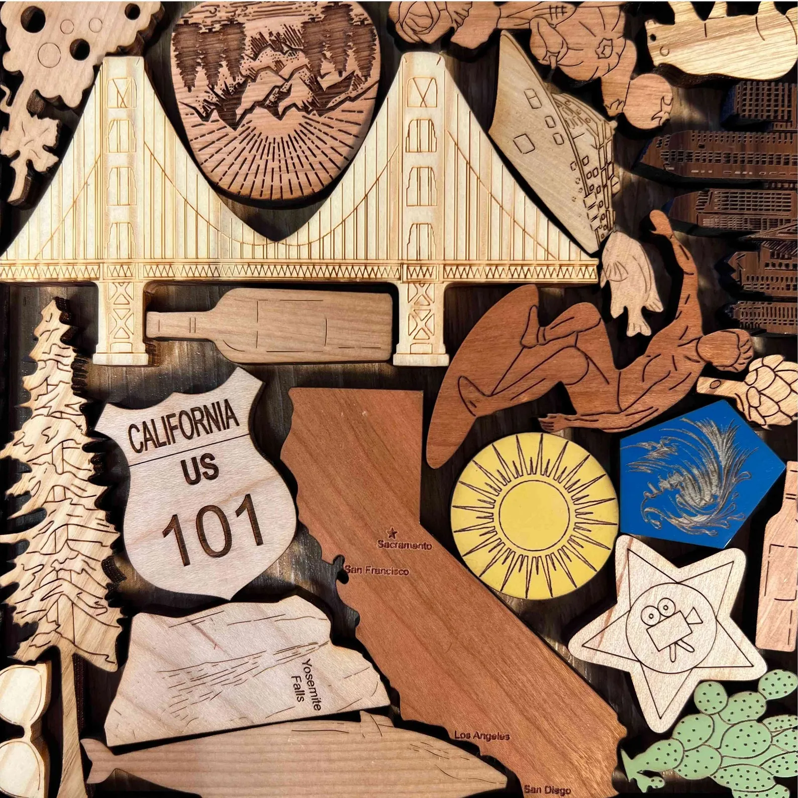 This challenging and artistic puzzle features items, creatures and scenes from the great state of California. Look for redwood, vegetables, Sun, wave, city scene, mountain scene, grapes and wine bottle, gray whale, Garibaldi fish, cactus, cruise ship, Yosemite and more!You’ll be stoked on this gnarly puzzle that might take a longer amount of time to solve than sitting in Los Angeles traffic.All original artwork that is precision laser etched and cut from at least 5 different 1/4 inch thick hardwoods.Made in USA by Creative Crafthouse