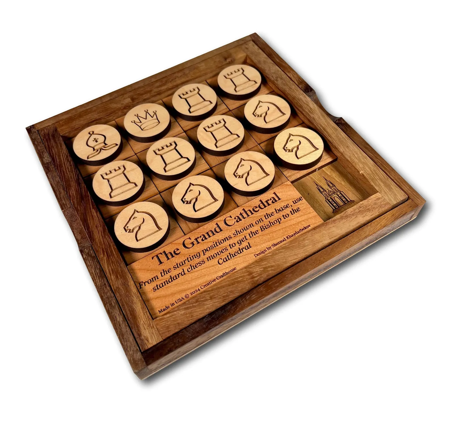 Can you guide the Bishop to the Cathedral by using standard chess moves to clear his path? This unique wood chess game features a laser-engraved board with starting positions for each piece lasered into the base. It’s a handcrafted game that offers a captivating logic game experience, perfect as a desk toy and brain teaser for both chess and non-chess players.From the starting positions, use standard chess moves to navigate the Bishop’s path from the top left corner to the Cathedral in the bottom right corner of the puzzle. You don’t need to be a chess player to enjoy this creative game; simply know the direction each of the three pieces can move, which is explained in the included instructions.This educational desk toy is designed to be a brain teaser that promotes strategic thinking. The set measures approximately 7.5″ square in the base, with pieces that are 1.5″ square and easy to manipulate. This artisan-crafted game is not only an unusual chess-related puzzle but also makes a unique gift for any chess player.Perfect for families, making it a fun chess challenge for kids and adults alike. Made by CreativeCrafthouse and designed by Sherzod Khaydarbekov from Tashkent, Uzbekistan, this exclusive piece is a testament to craftsmanship and creativity.Made in USA ? 2024 Creative CrafthouseDesign by Sherzod Khaydarbekov,from Tashkent, Uzbekistan