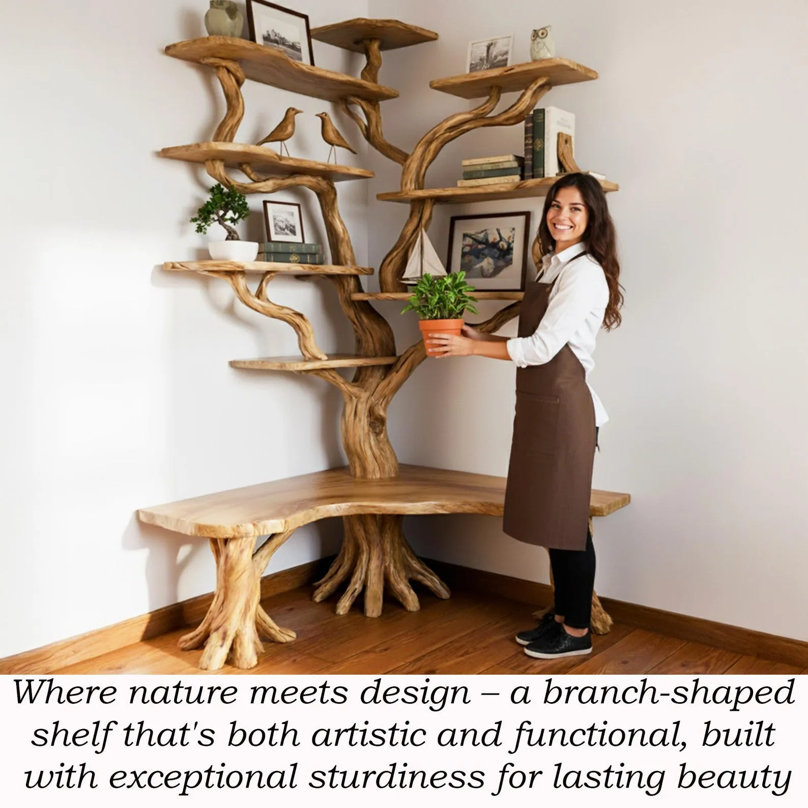 Durable Solid Wood Construction tree branch bookcase is designed to last for generations, strong enough to hold books, plants, pottery, or collectibles.