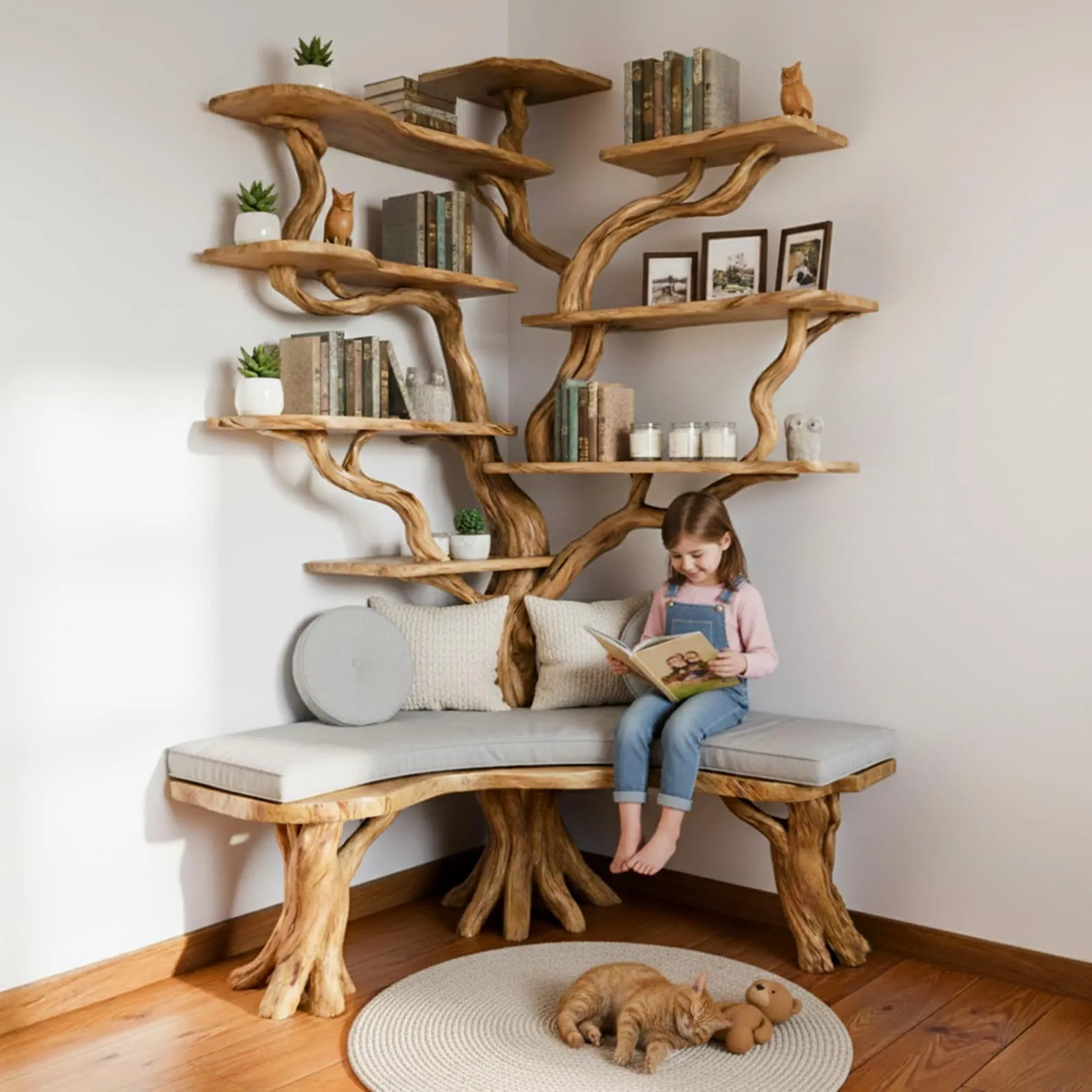 Rustic Solid Wood Tree Bookshelf Branch Design Corner Book Shelf & Floating Shelves | Decor Japandi Farmhouse Eco-Friendly Floating Shelves