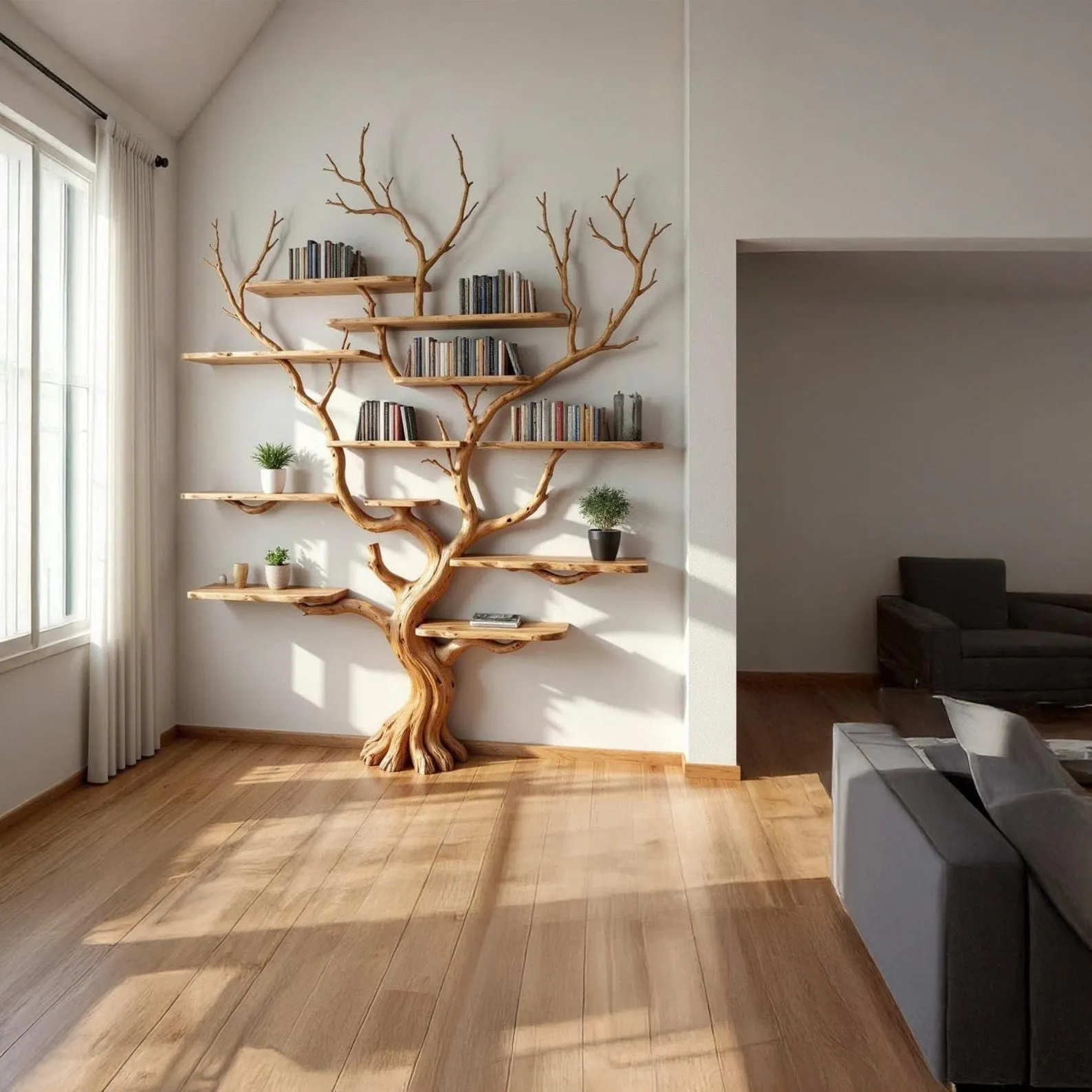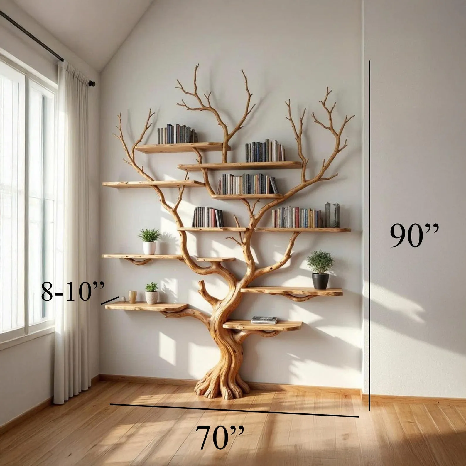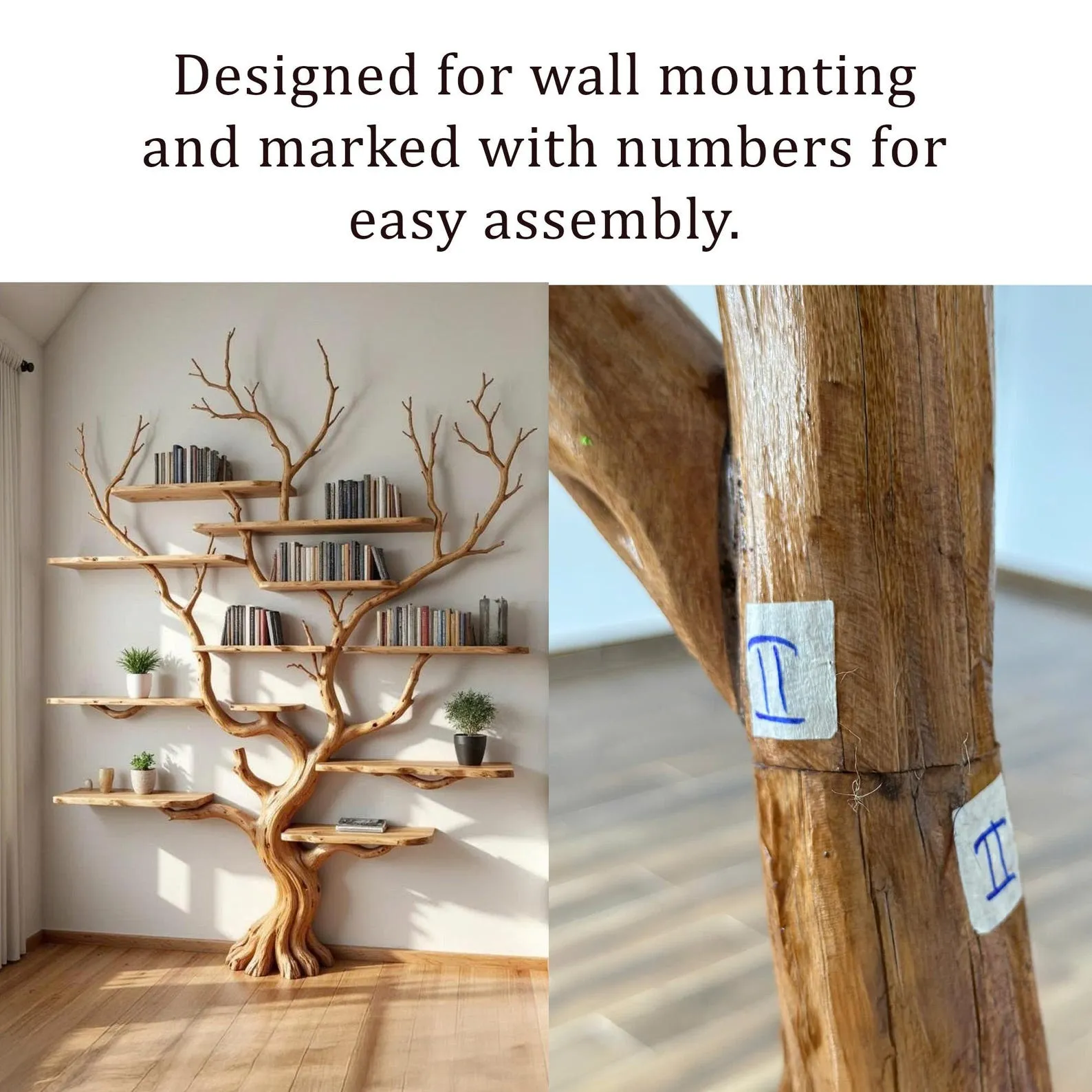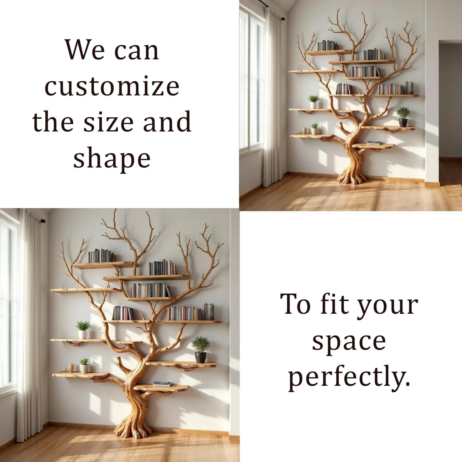 Solid wood tree bookshelf scupltured driftwood tree branch bookcase wall mount live edge bookshelf handcrafted living room decoration