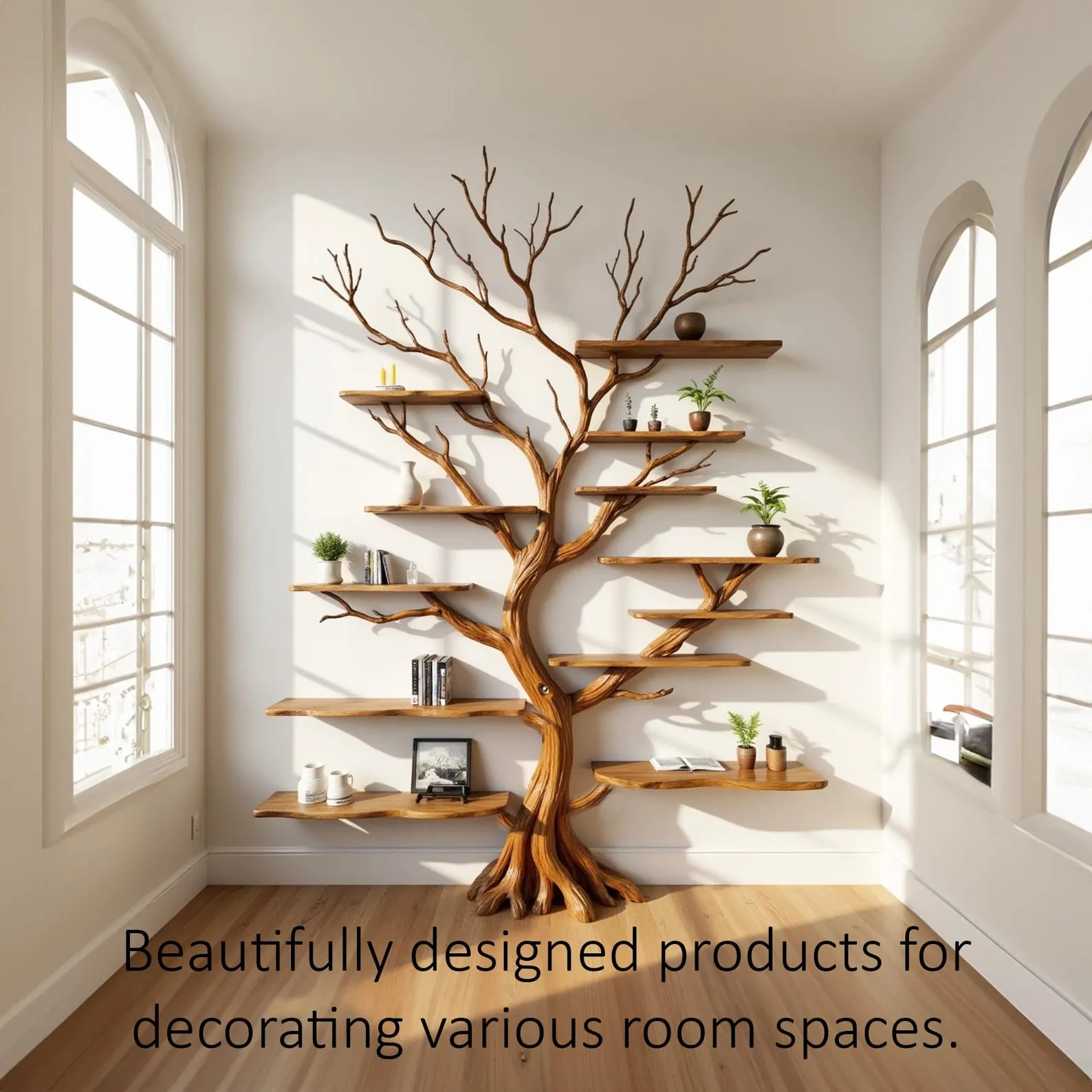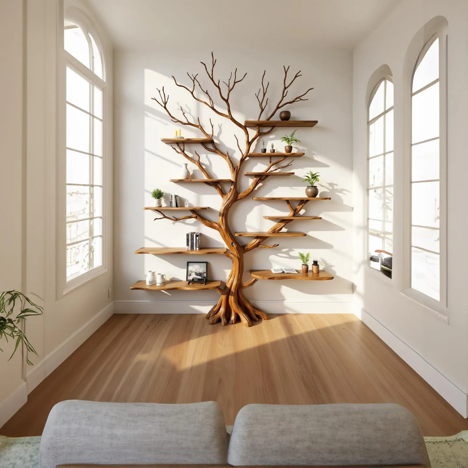This uniquely designed corner shelf is a stunning blend of nature-inspired aesthetics and functional home Decor. Crafted from rich, dark wood, the shelf mimics the organic shape of a tree, with gracefully branching supports that resemble twisting tree limbs. Each shelf tier appears to “grow” from the central structure, creating a visually striking, flowing form that integrates seamlessly into the corner of the room.There are four tiers in total, each offering a stable platform for displaying items such as small potted plants, minimalist ceramic vases, or compact books. The natural wood grain is beautifully preserved, adding warmth and texture to the space. Its smooth finish and artistic craftsmanship suggest careful, handmade construction, likely intended to serve as both a piece of furniture and a sculptural element.Positioned near a window with soft, natural lighting, the shelf exudes a tranquil, Zen-like ambiance. It’s perfect for anyone who appreciates biophilic design or wants to bring an element of the outdoors into their living space. The arrangement encourages minimalism and thoughtful curation, making it an ideal fit for modern, rustic, or Scandinavian interiors.Overall, this wooden corner shelf is more than just storage’it’s a work of art that transforms an ordinary room corner into a captivating focal point. Whether in a living room, study, or bedroom, it invites calm and creativity with its organic form and natural elegance.
