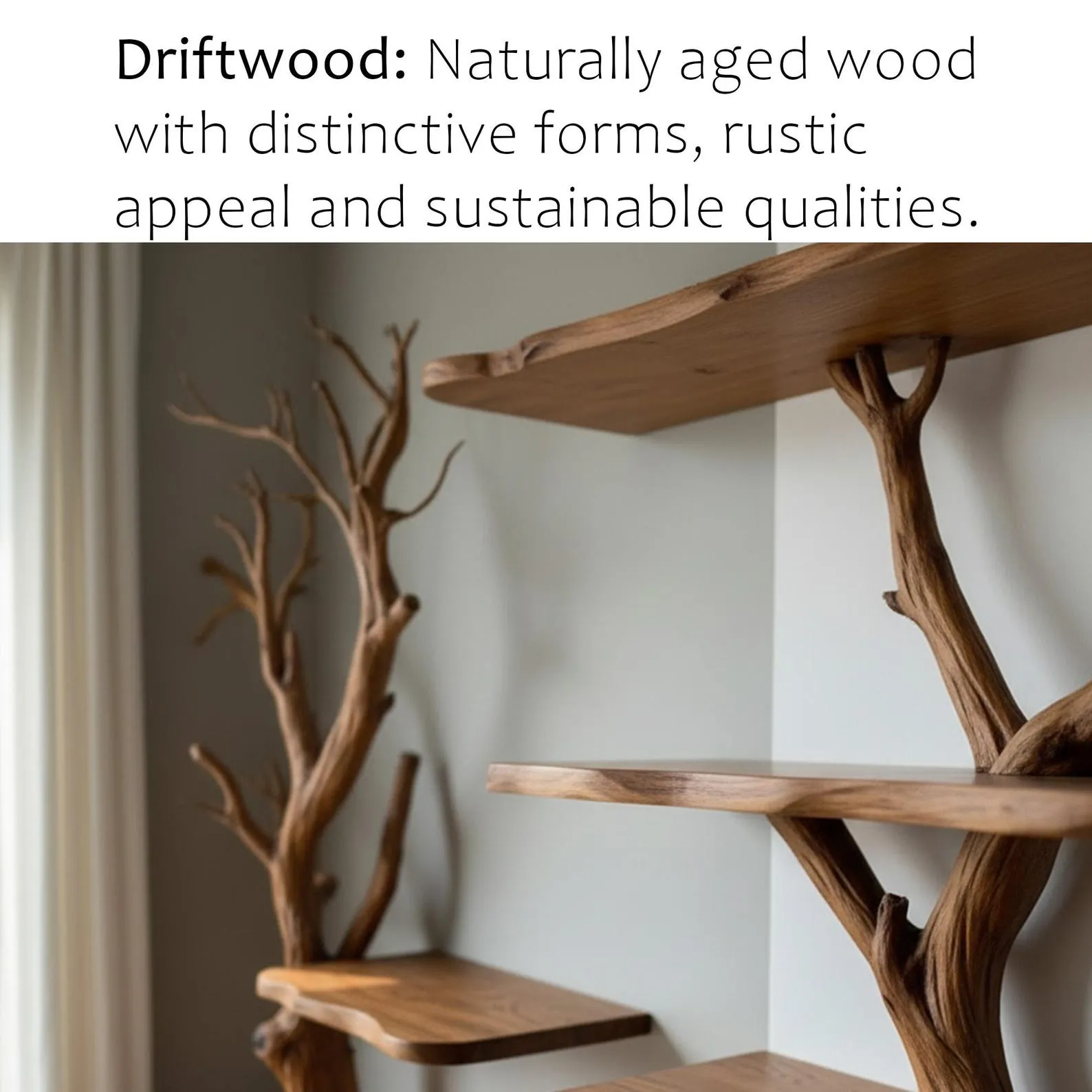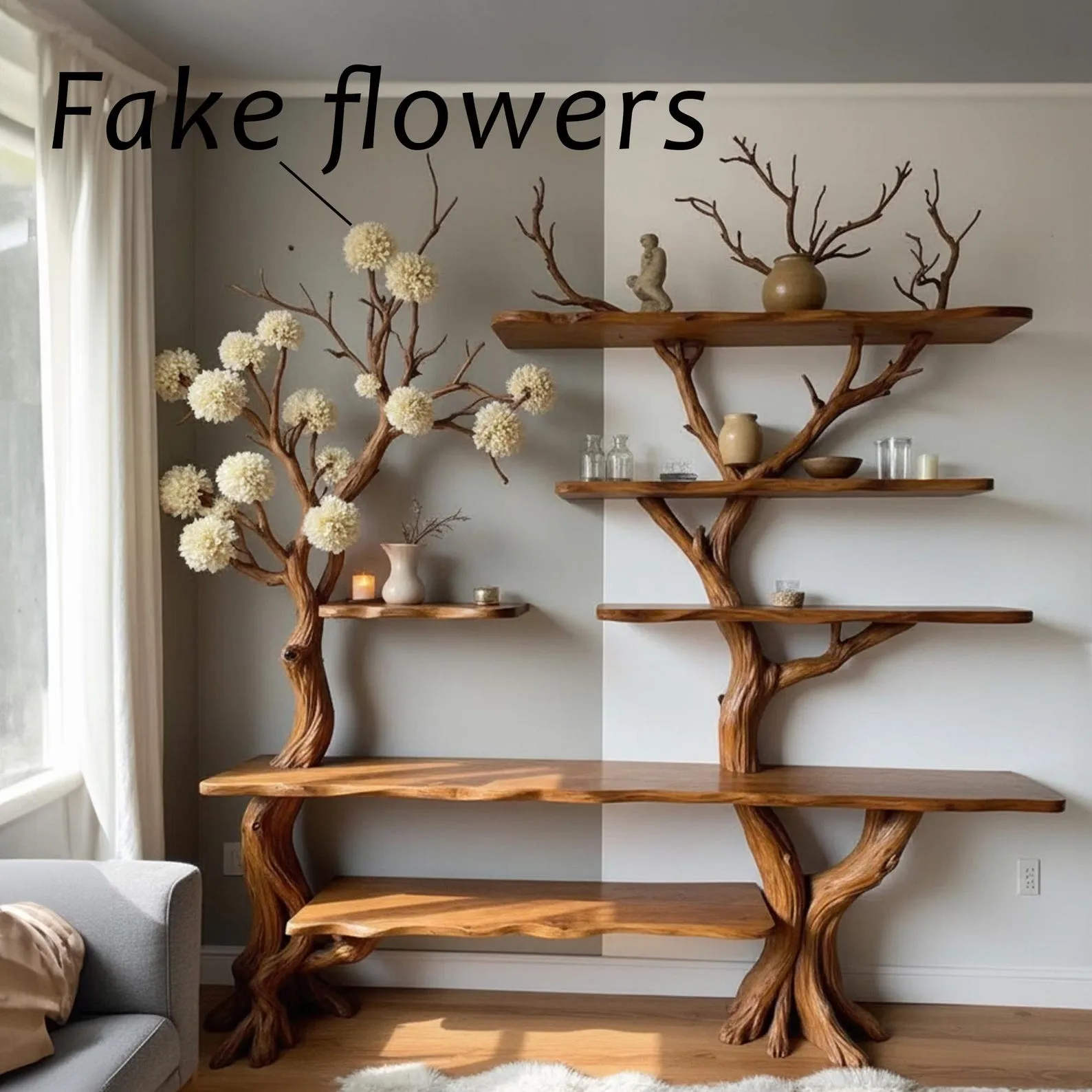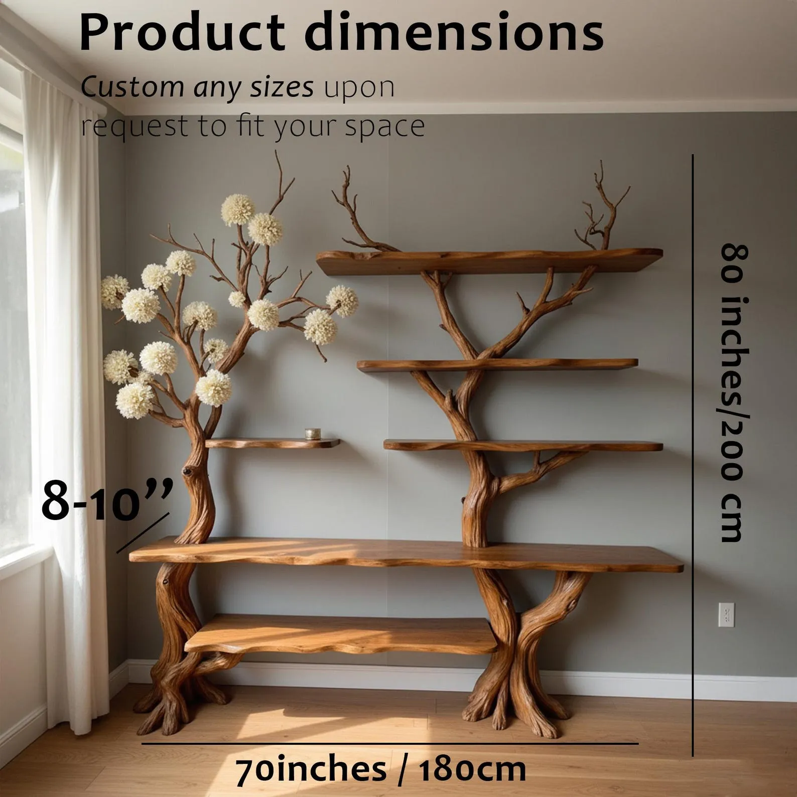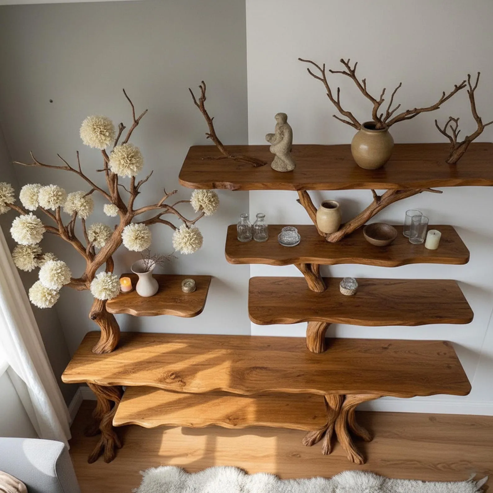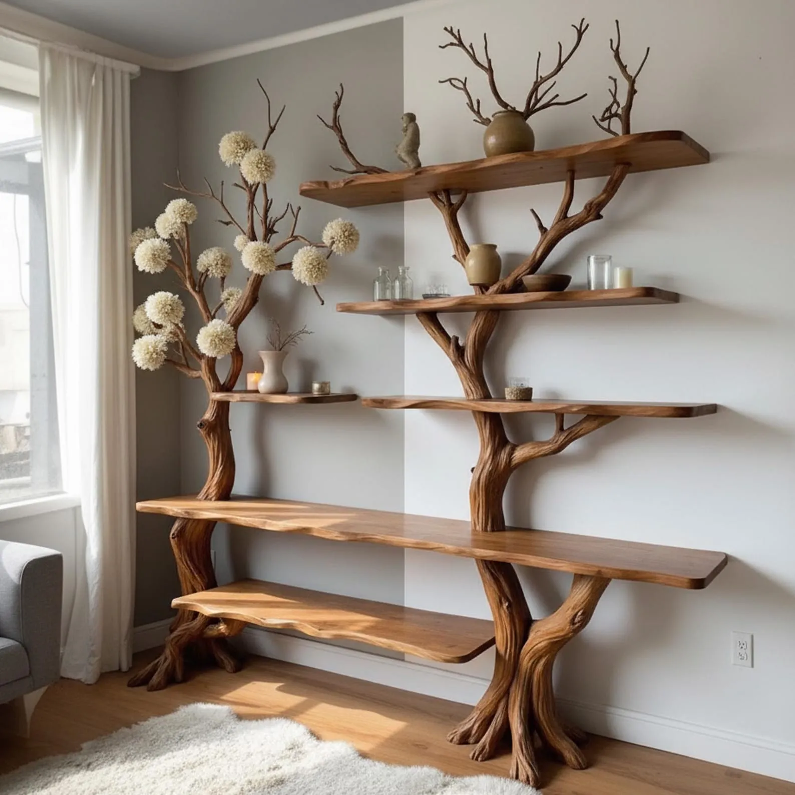 This uniquely designed natural wood bookcase is a stunning blend of nature-inspired aesthetics and functional home Decor. Crafted from rich, dark wood, the shelf mimics the organic shape of a tree, with gracefully branching supports that resemble twisting tree limbs. Each shelf tier appears to “grow” from the central structure, creating a visually striking, flowing form that integrates seamlessly into the corner of the room.Positioned near a window with soft, natural lighting, the shelf exudes a tranquil, Zen-like ambiance. It’s perfect for anyone who appreciates biophilic design or wants to bring an element of the outdoors into their living space. The arrangement encourages minimalism and thoughtful curation, making it an ideal fit for modern, rustic, or Scandinavian interiors.There are four tiers in total, each offering a stable platform for displaying items such as small potted plants, minimalist ceramic vases, or compact books. The natural wood grain is beautifully preserved, adding warmth and texture to the space. Its smooth finish and artistic craftsmanship suggest careful, handmade construction, likely intended to serve as both a piece of furniture and a sculptural element.Overall, this tree branch book shelf is more than just storage’it’s a work of art that transforms an ordinary room corner into a captivating focal point. Whether in a living room, study, or bedroom, it invites calm and creativity with its organic form and natural elegance.