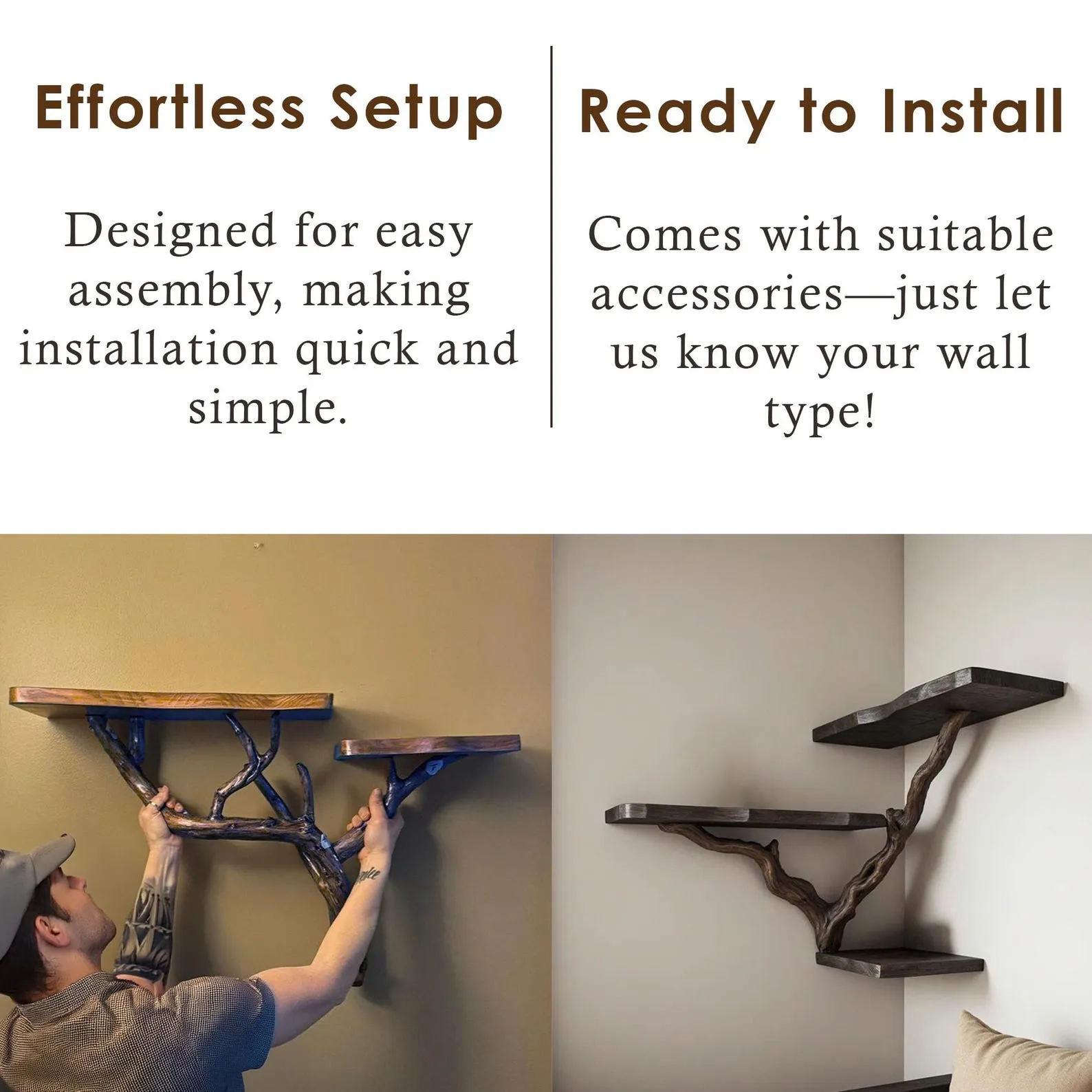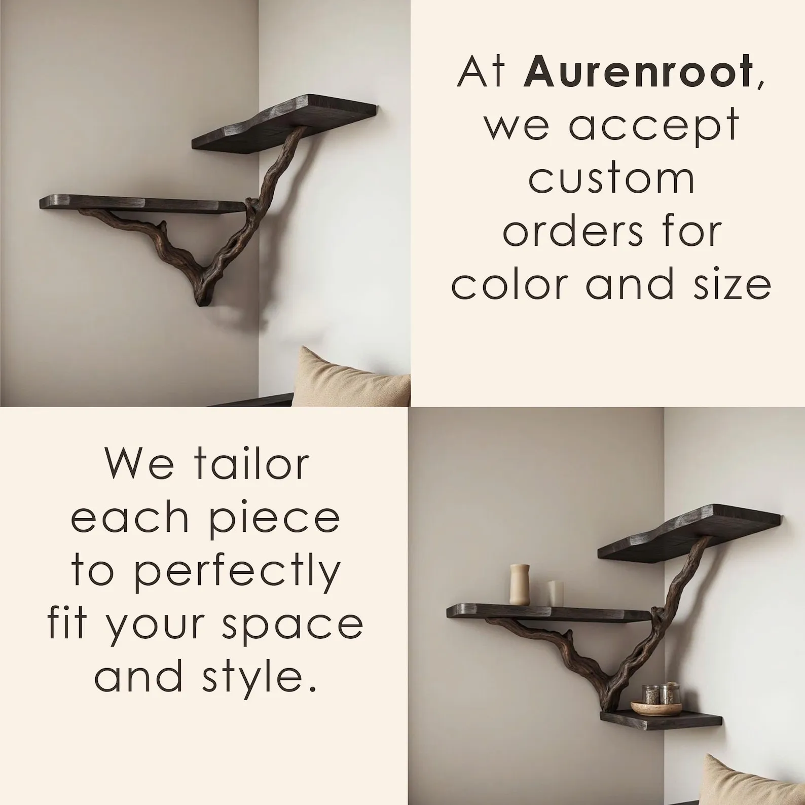 Aurenroot made this Natural Wood bookshelf from handcarved solid wood, with the branch crafted from natural driftwood branch and the shelves are made from natural solid wood. This natural wood bookshelf is a stunning example of handmade furniture, designed to bring the beauty of nature into your home. Each piece is meticulously handmade, ensuring no two bookshelves are exactly the same every tree branch shelving unit features its own unique natural characteristics.We offer customizable sizes and colors, so just share your idea with us, and we’ll bring it to life. Need help selecting the right accessories for your wall type? Message us, and we’ll guide you through the options.After your purchase, please check your email and messages, as we may send a photo of your custom piece before shipping to ensure it meets your expectations.Looking forward to serving you, we cherish the opportunity to create something as unique and special as your home.