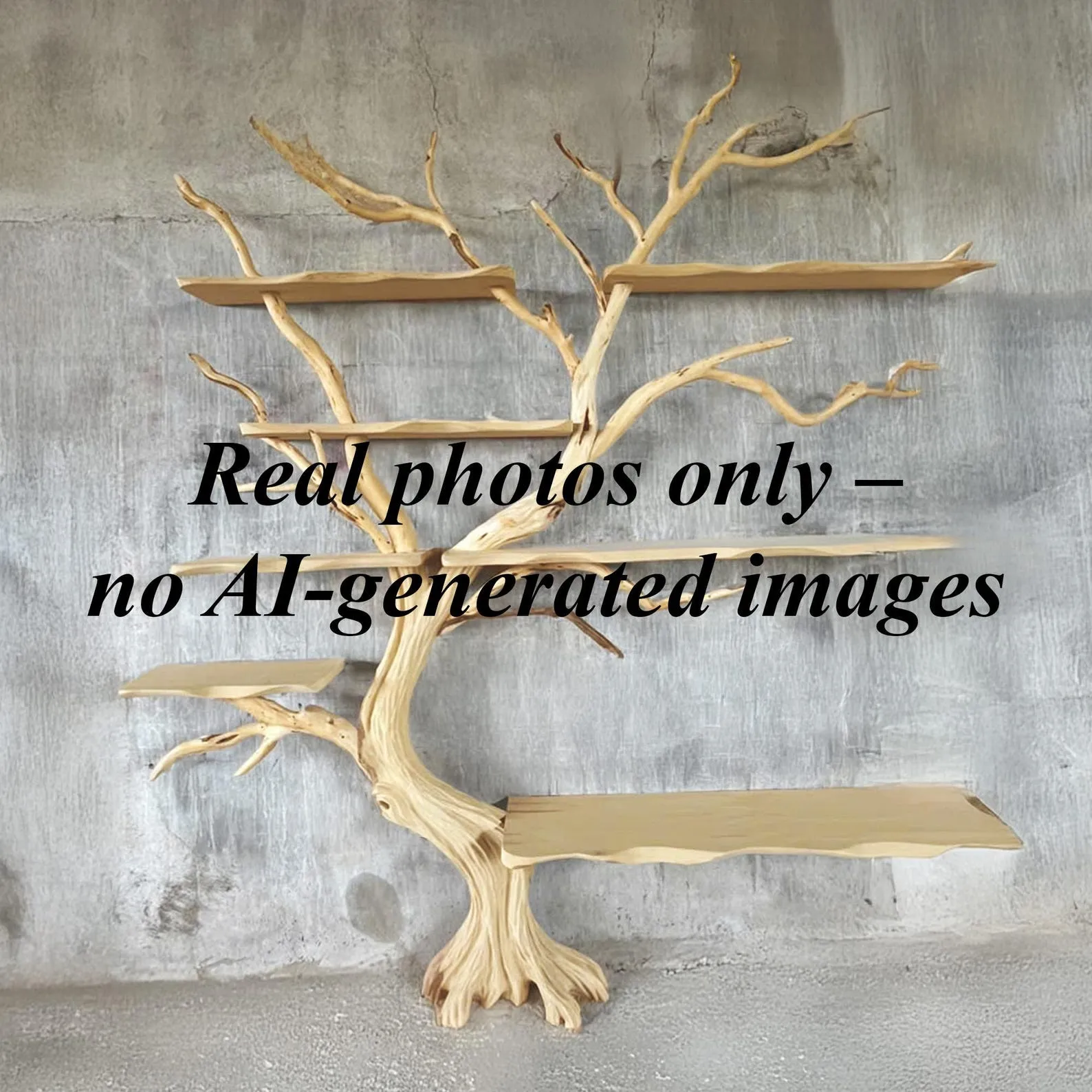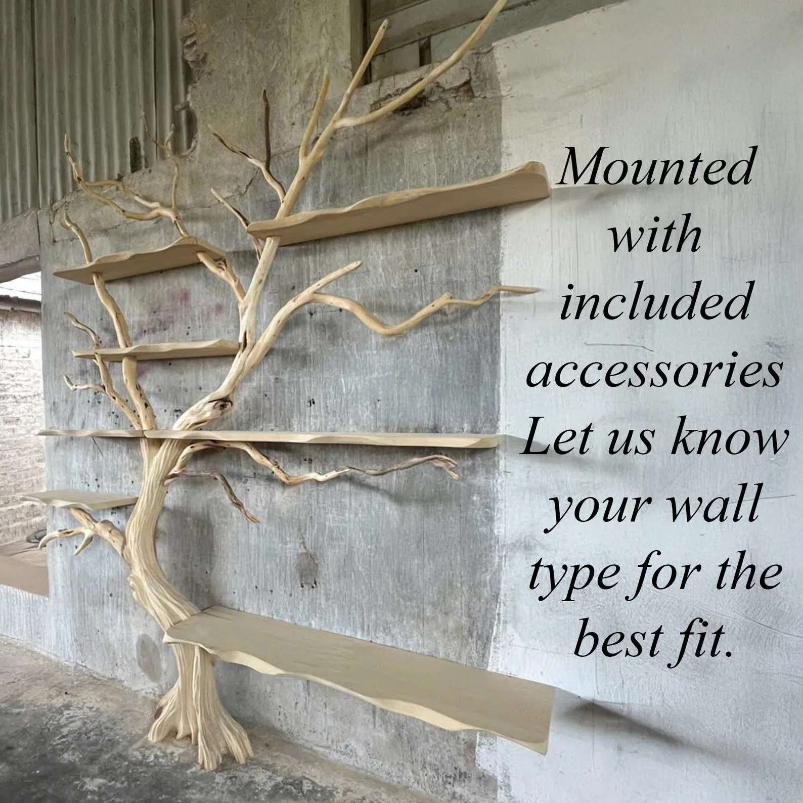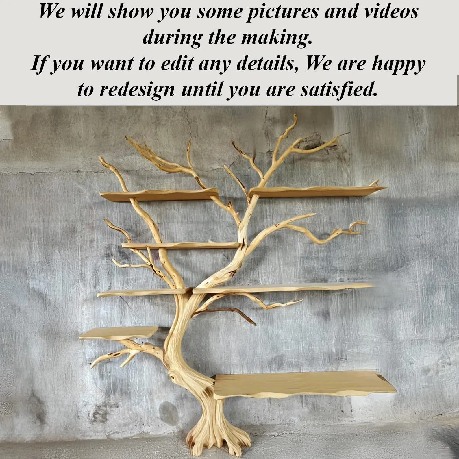 A natural wood bookshelf on wall combined with natural branches, crafted from wood, creates a captivating and organic piece of furniture that seamlessly marries the warmth of wood with the raw beauty of nature. This unique design not only provides practical storage but also introduces a rustic and natural aesthetic to your living space.We are dedicated to sourcing the most exquisite tree branches from the forest for the crafting of your products. Prior to shipping, we will provide you with photographs of product to ensure your utmost satisfaction so please maintain communication with us throughout the order fulfillment process to ensure the swift completion and prompt delivery of your product.We kindly hope you can give us your phone number to ensure a seamless delivery process. Your cooperation in providing this information is crucial for ensuring the safe and efficient arrival of your valuable purchase.The tree shape bookshelf is constructed using sturdy and durable wood, ensuring both functionality and longevity. The integration of real tree branches into the design adds an authentic touch, with the natural texture and variations in the wood enhancing the overall visual appeal.The shelves, made from the quality wood, offer ample space for organizing books and displaying decorative items. The incorporation of natural branches as part of the support structure not only reinforces the shelving but also brings a touch of the outdoors inside.This floor bookcase solid wood with natural branches is an excellent choice for those who appreciate the beauty of natural materials and seek a piece of furniture that blends seamlessly with both modern and rustic interior styles. It serves as a functional storage solution while adding a unique and earthy charm to your home decor.? Please allow for a 1-3 inch variance due to manual measurements.? If you require custom adjustments to the shelf dimensions or tree branch design, please feel free to contact us; we are ready to design it to fit seamlessly into your living space.? Please see assembly instructions here: https://www.youtube.com/watch?v=aQ5QKIyKk8gI am so happy to service you ????