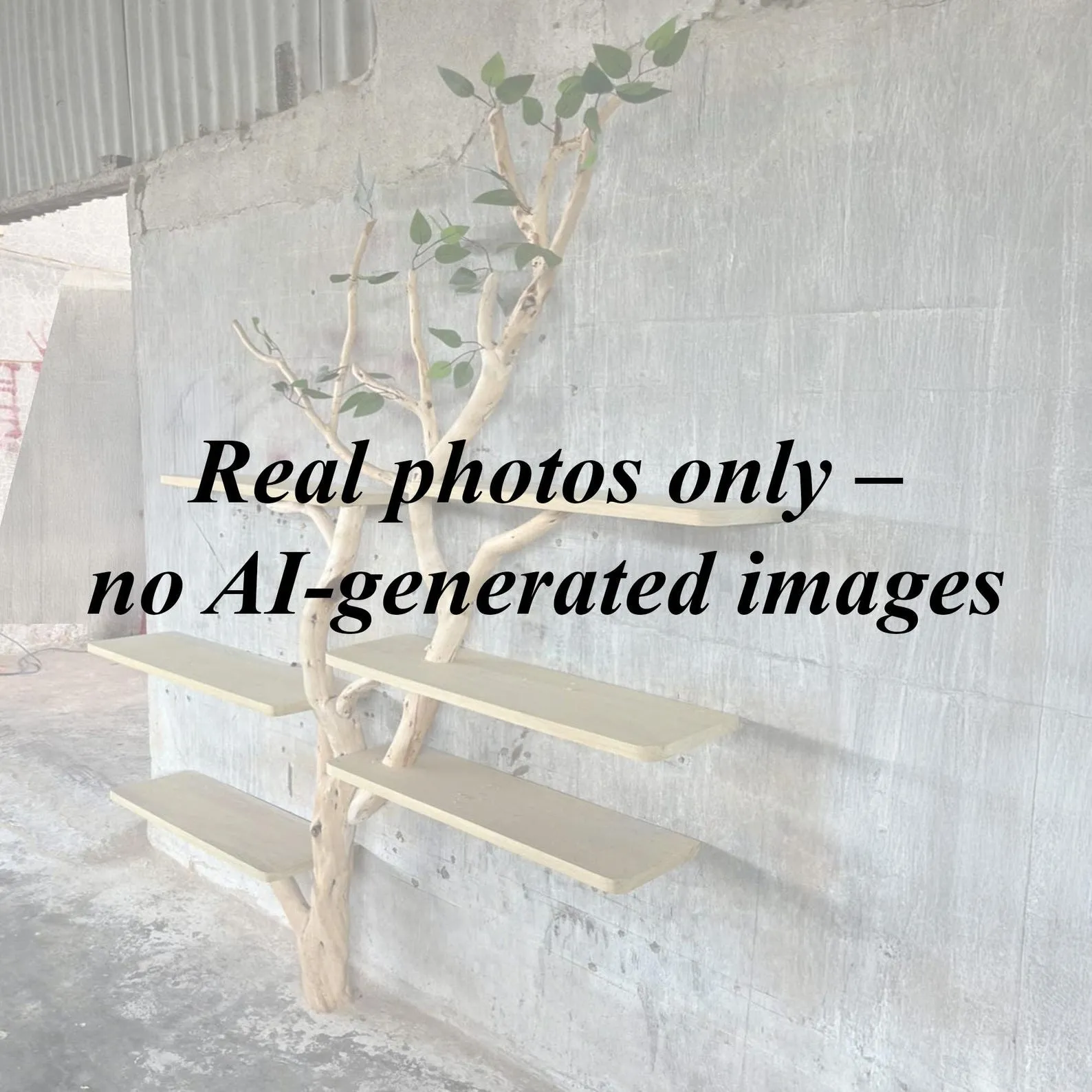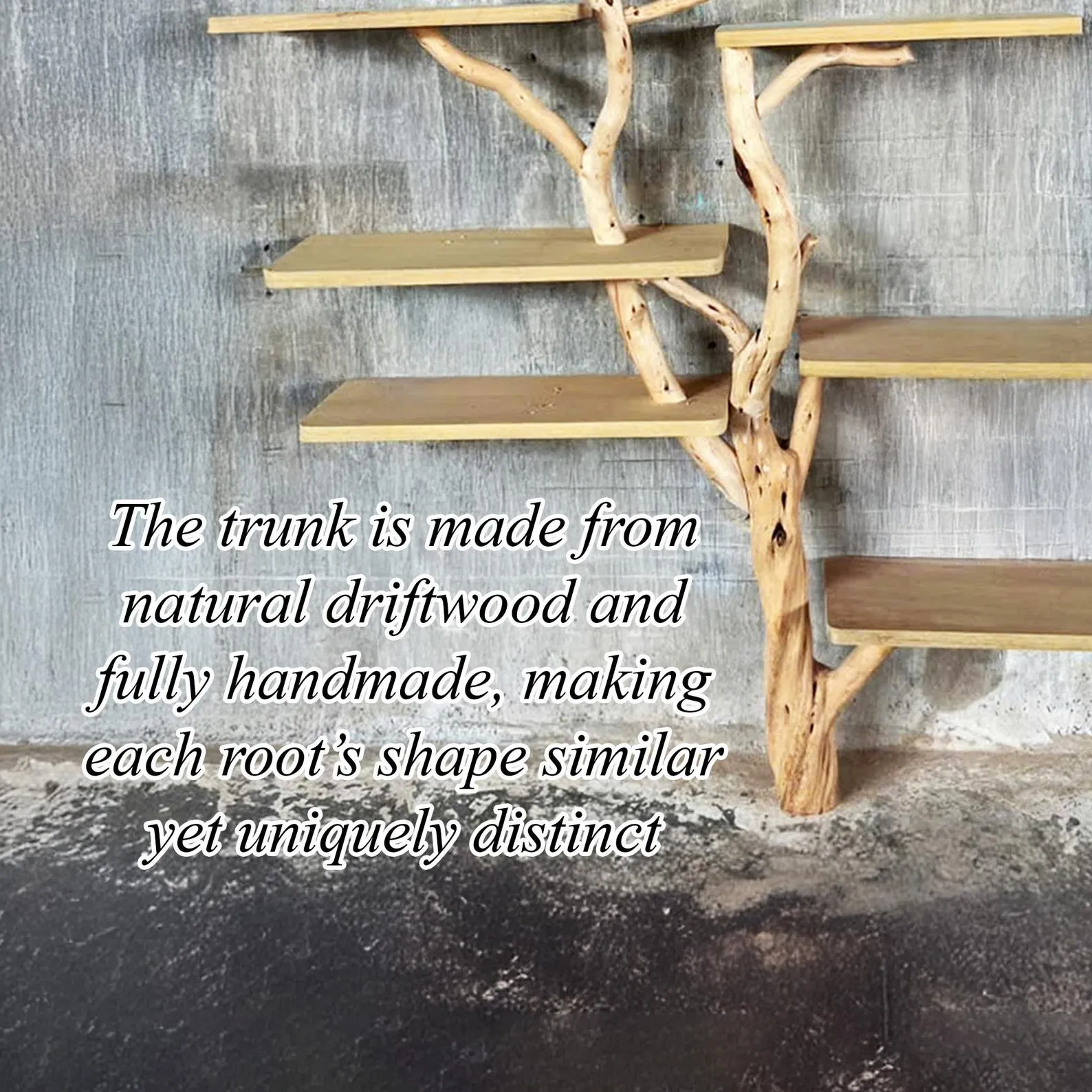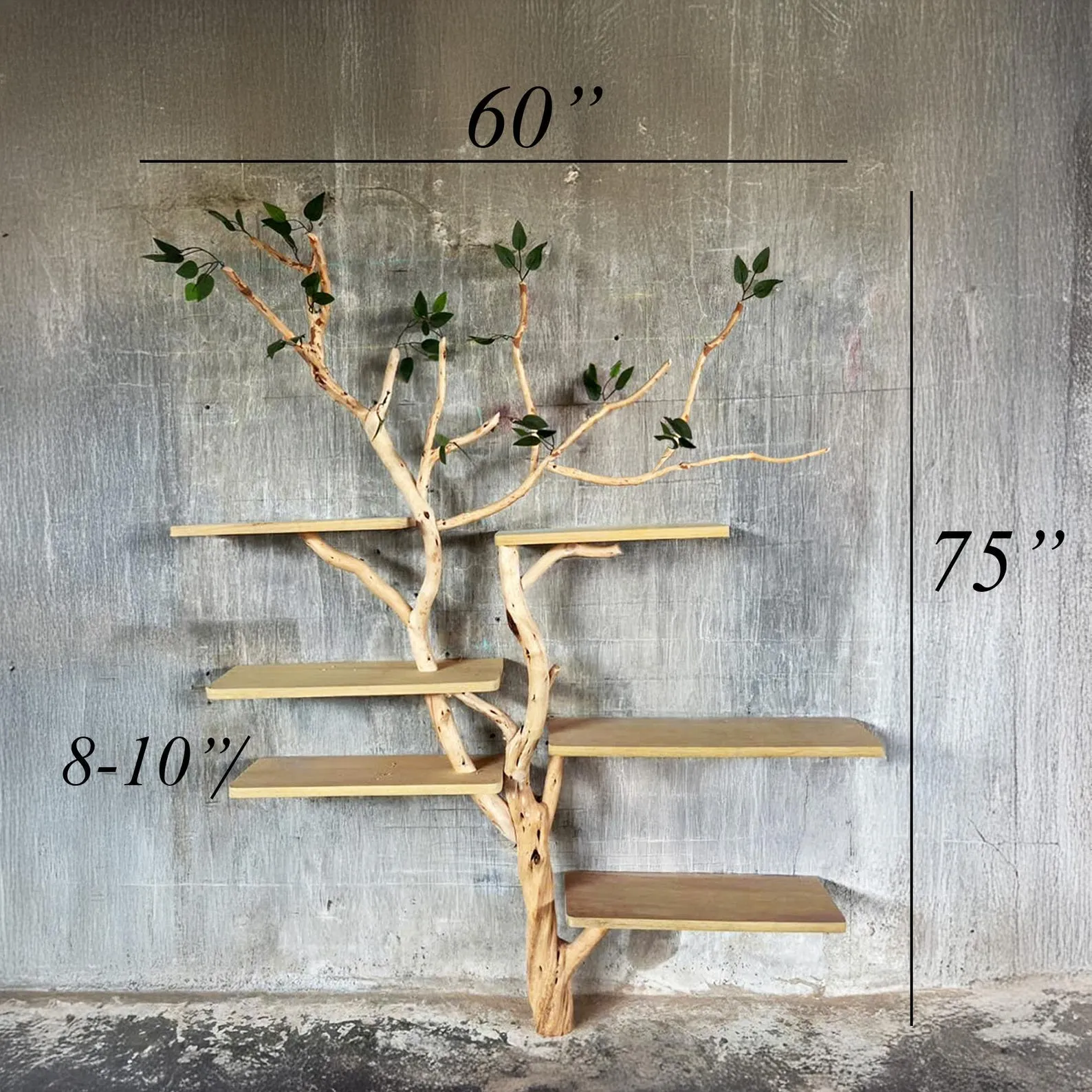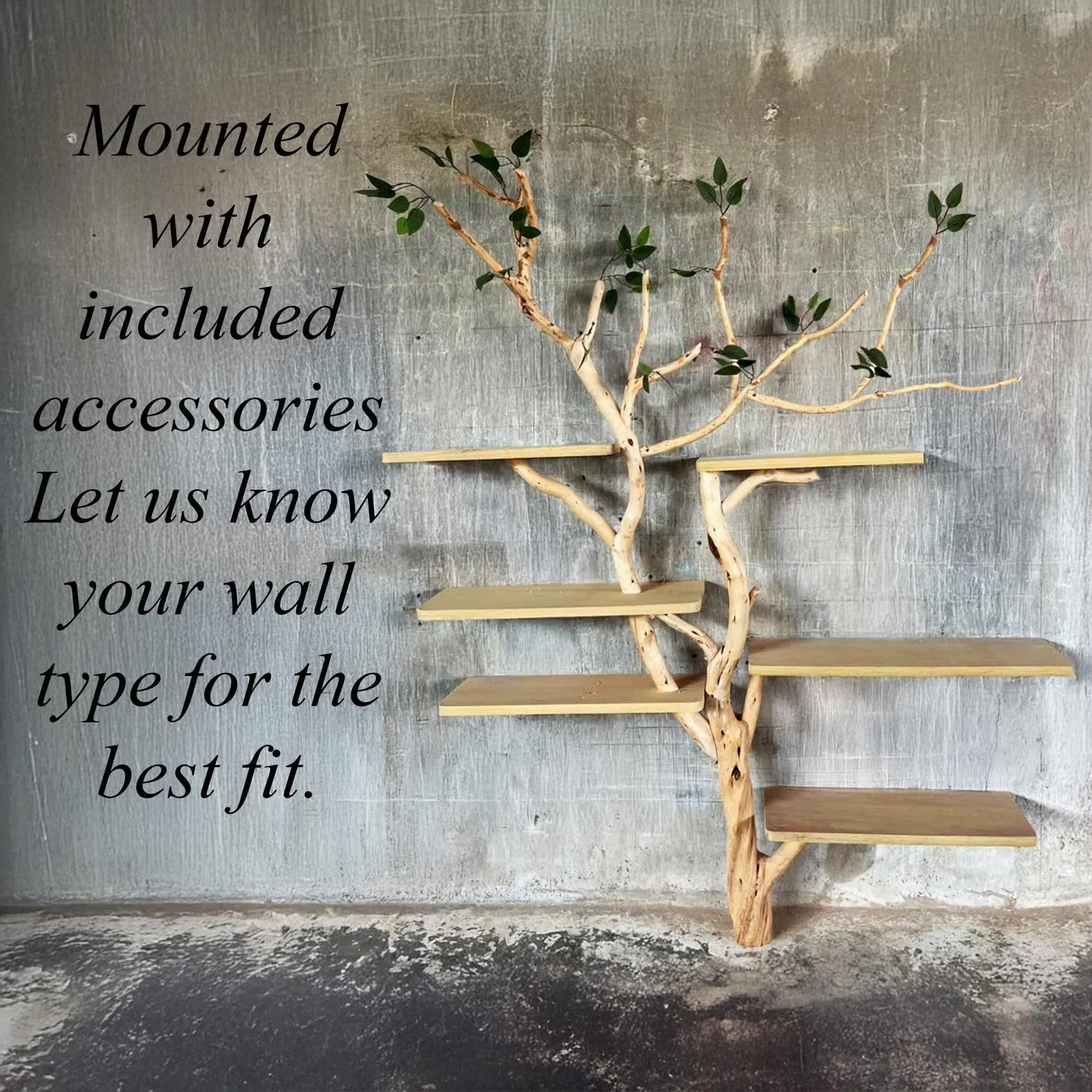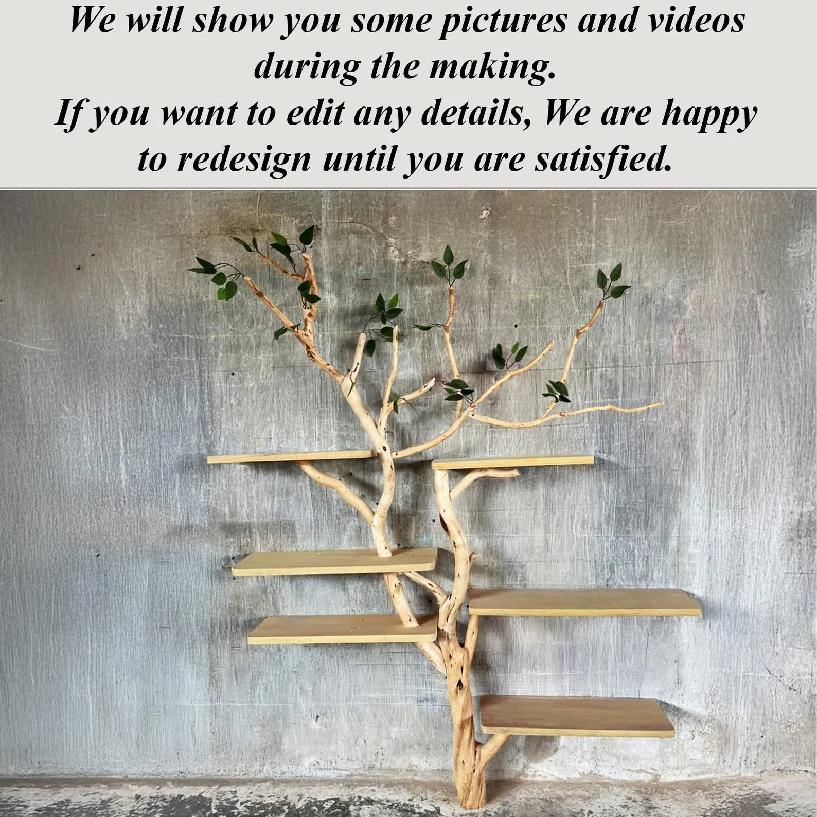 A floating tree bookshelf on wall combined with natural branches, crafted from wood, creates a captivating and organic piece of furniture that seamlessly marries the warmth of wood with the raw beauty of nature. This unique design not only provides practical storage but also introduces a rustic and natural aesthetic to your living space.We are dedicated to sourcing the most exquisite tree branches from the forest for the crafting of your products. Prior to shipping, we will provide you with photographs of product to ensure your utmost satisfaction so please maintain communication with us throughout the order fulfillment process to ensure the swift completion and prompt delivery of your product.We kindly hope you can give us your phone number to ensure a seamless delivery process. Your cooperation in providing this information is crucial for ensuring the safe and efficient arrival of your valuable purchase.The bookshelf is constructed using sturdy and durable wood, ensuring both functionality and longevity. The integration of real tree branches into the design adds an authentic touch, with the natural texture and variations in the wood enhancing the overall visual appeal.The shelves, made from the quality wood, offer ample space for organizing books and displaying decorative items. The incorporation of natural branches as part of the support structure not only reinforces the shelving but also brings a touch of the outdoors inside.This natural wood bookshelf with natural branches is an excellent choice for those who appreciate the beauty of natural materials and seek a piece of furniture that blends seamlessly with both modern and rustic interior styles. It serves as a functional storage solution while adding a unique and earthy charm to your home decor.? Please allow for a 1-3 inch variance due to manual measurements.? If you require custom adjustments to the shelf dimensions or tree branch design, please feel free to contact us; we are ready to design it to fit seamlessly into your living space.? Please see assembly instructions here: https://www.youtube.com/watch?v=aQ5QKIyKk8gI am so happy to service you ????