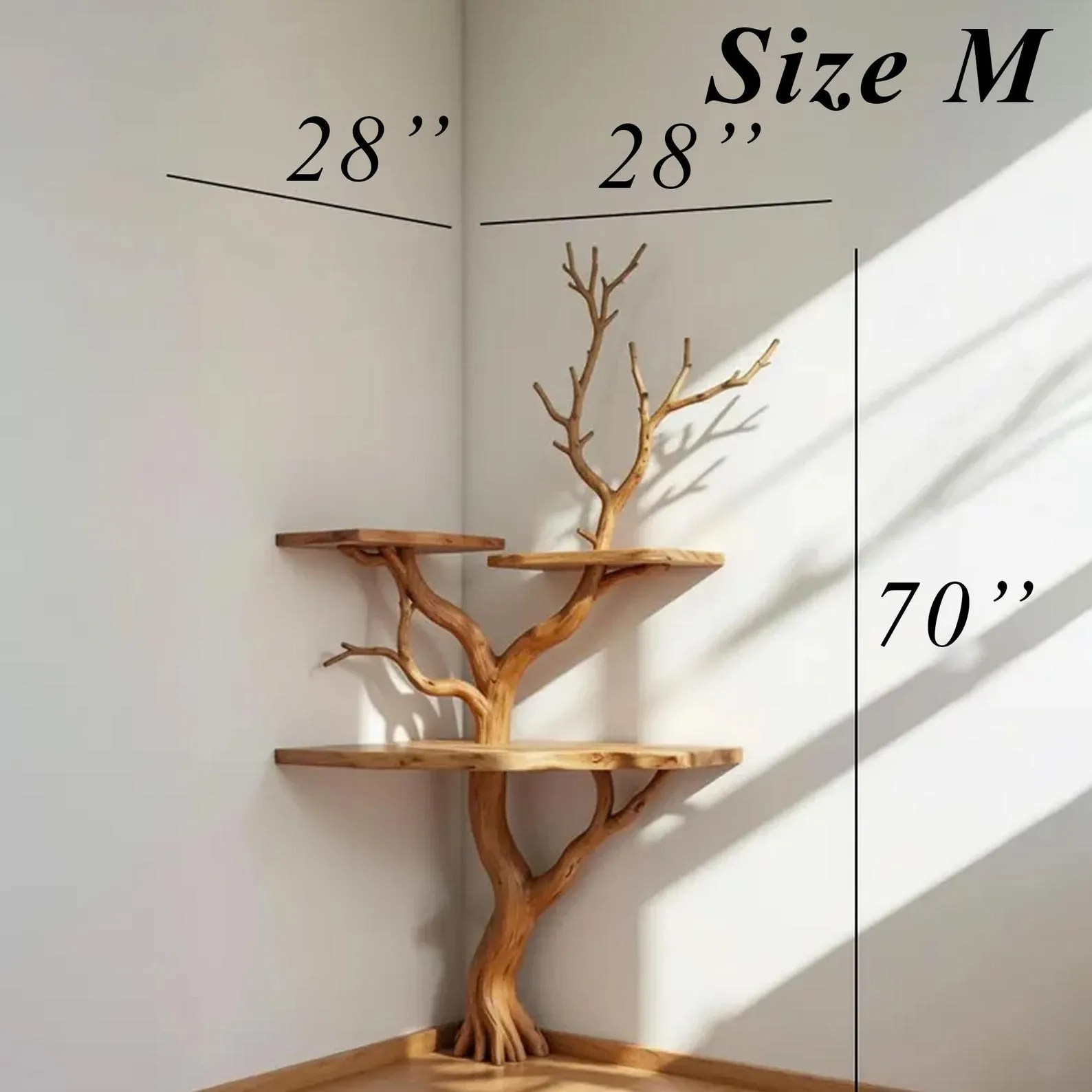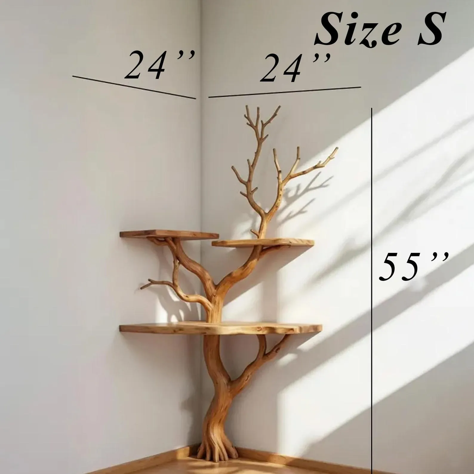 Transform any empty corner into a natural focal point with this handmade wooden corner tree bookshelf, crafted from real solid wood with flowing organic branches. Its sculptural form brings the warmth of nature indoors while providing a unique way to display your favorite items.Each rustic solid wood branch wall shelf is carefully handcrafted by skilled artisans, highlighting the natural curves and textures of the wood. Every piece is one-of-a-kind, with slight variations in color, grain, and dimension that give it authenticity and charm.This eco-friendly natural wood corner wall Decorr shelf is perfect for holding books, small plants, candles, ceramics, or framed photos. Its vertical design helps maximize wall space, making it a smart choice for apartments, bedrooms, offices, or reading nooks. The combination of functionality and artistry makes this piece equally useful as storage and as a decorative statement.Your artisan carved tree shaped shelving unit arrives with mounting hardware for easy installation. Because each design is made to order, you can also request customized sizing, finishes, or tones to perfectly match your interior.Carefully packaged and shipped worldwide with trusted carriers like DHL, UPS, and FedEx, this unique organic solid wood corner bookshelf blends seamlessly with rustic farmhouse, Scandinavian, bohemian, or minimalist Decorr.Elevate your space with a custom handcrafted tree branch corner shelfa timeless piece that merges natural beauty, craftsmanship, and everyday function.