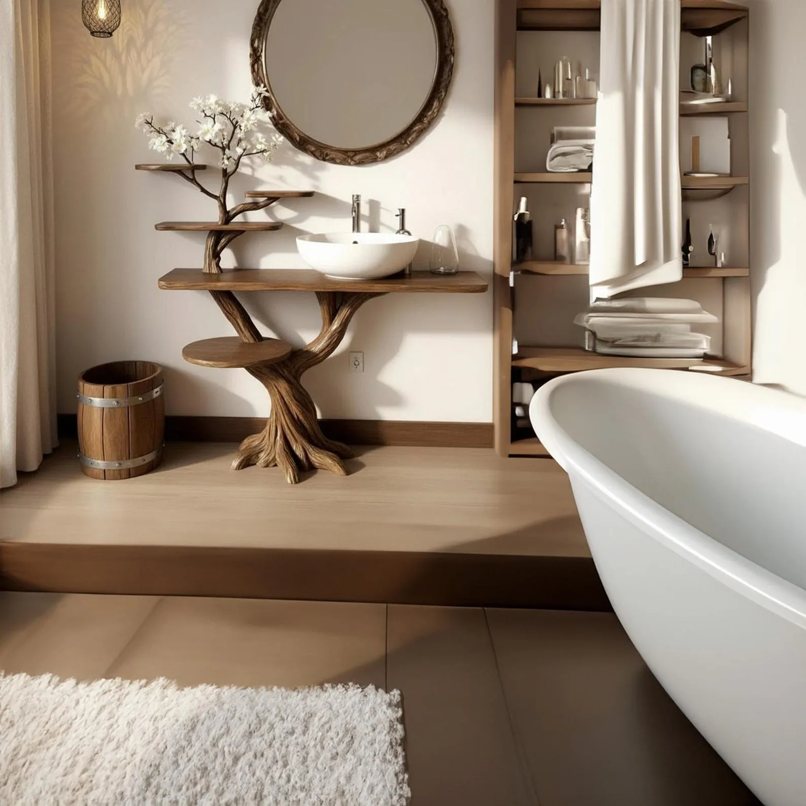 Each vanity is a one-of-a-kind masterpiece, hand-sculpted by skilled wood artisans who carefully select sustainably sourced hardwoods with rich tones and unique grain patterns. The organic branch-inspired structure not only supports the basin with strength and balance but also offers layered shelves for decoration or storage perfect for plants, towels, or daily essentials.