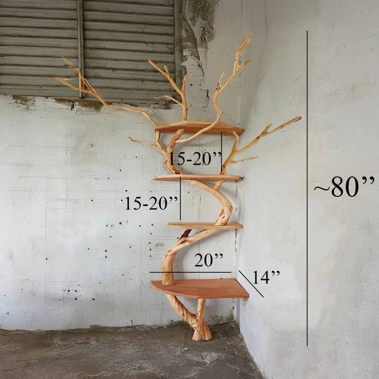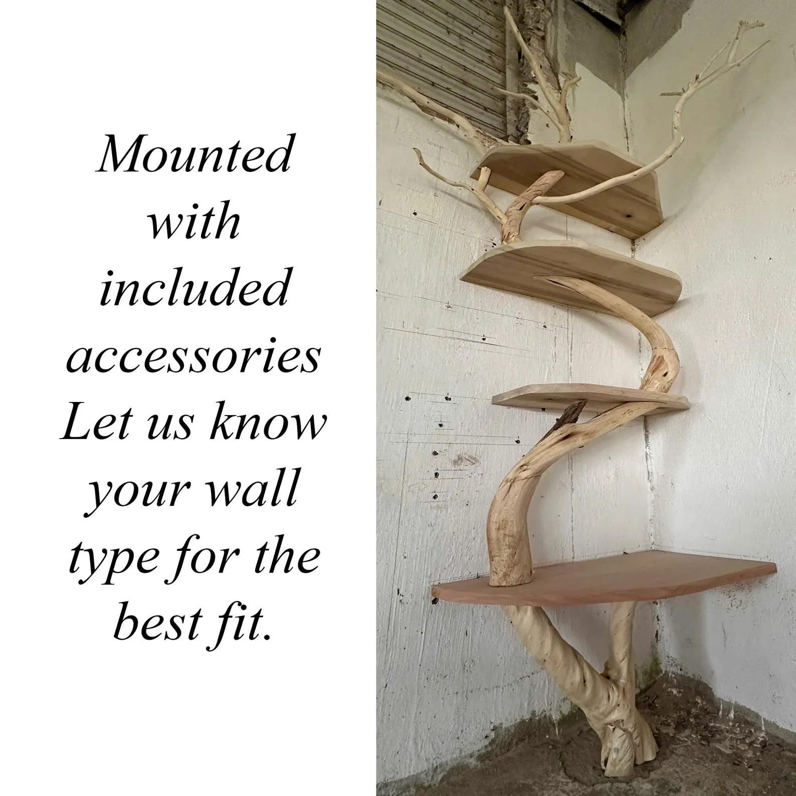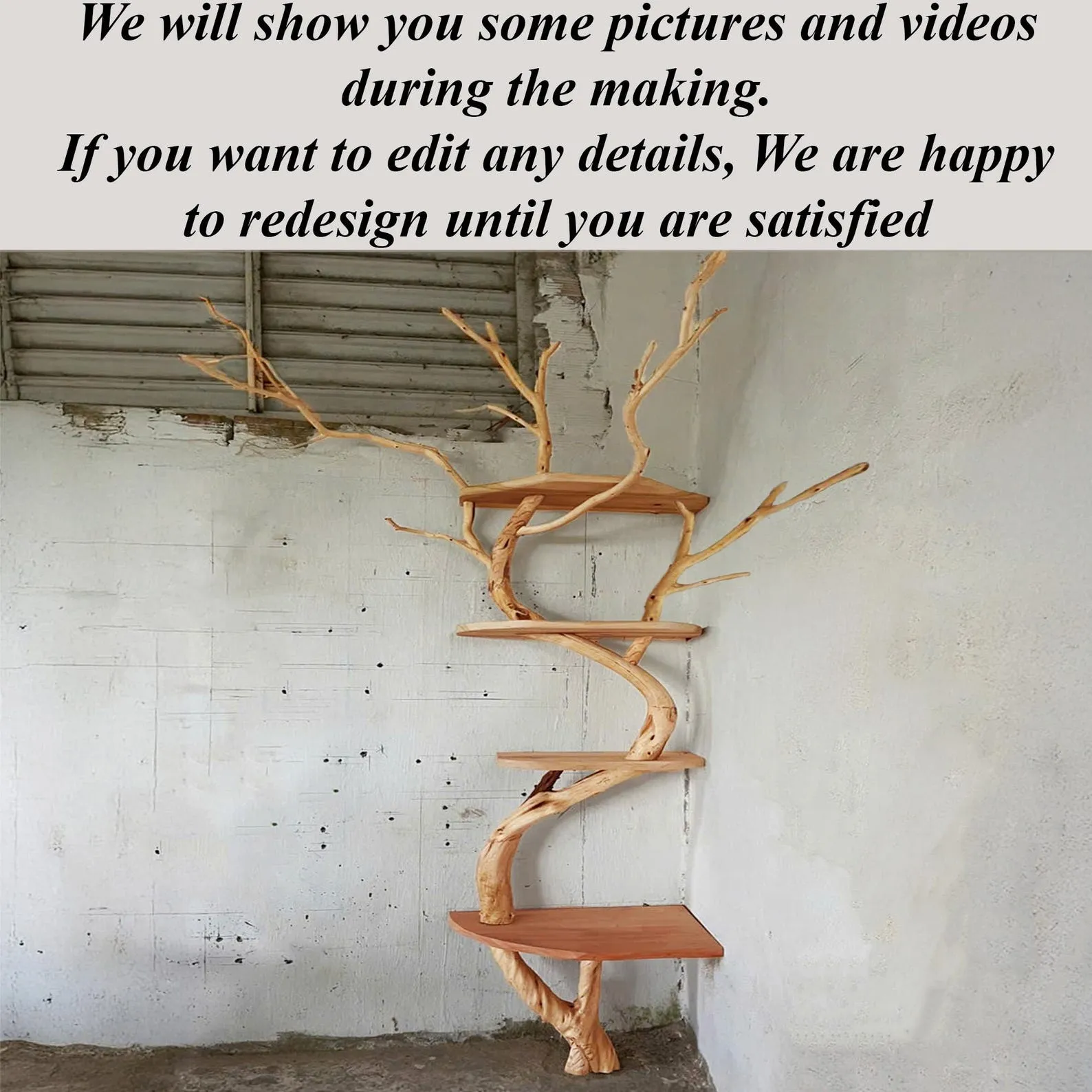 Antique shelving unit crafted from solid wood, this tree branch live edge corner shelf seamlessly combines practical storage with the raw beauty of nature by incorporating real tree branches into its design. The unique fusion of wood warmth and natural aesthetics creates an organic piece of furniture that adds rustic charm to any living space.The sturdy construction ensures both functionality and longevity, while the integration of real tree branches adds an authentic touch, enhancing the overall visual appeal with natural textures and variations in the wood.Made from high-quality wood, the shelves provide ample space for organizing books and displaying decorative items. The incorporation of natural branches as part of the support structure not only reinforces the shelving but also brings a touch of the outdoors inside.Ideal for those who appreciate the beauty of natural materials, this tree shape bookshelf with natural branches effortlessly blends with both modern and rustic interior styles. It not only serves as a functional storage solution but also adds a unique and earthy charm to home decor.Please see more similar unique Tree Branch Coat Rack here:www.etsy.com/shop/BonsaiHandcraft?ref=seller-platform-mcnav?ion_id=54460592? Please allow for a 1-3 inch variance due to manual measurements.? For custom adjustments to shelf dimensions or tree branch design, feel free to contact us; we are ready to design it to seamlessly fit into your living space.? Please see assembly instructions here: https://youtube.com/shorts/mrrFIbs3edg?si=lLEieOR5ZFBS670jWe take pride in serving you with dedication and care ????