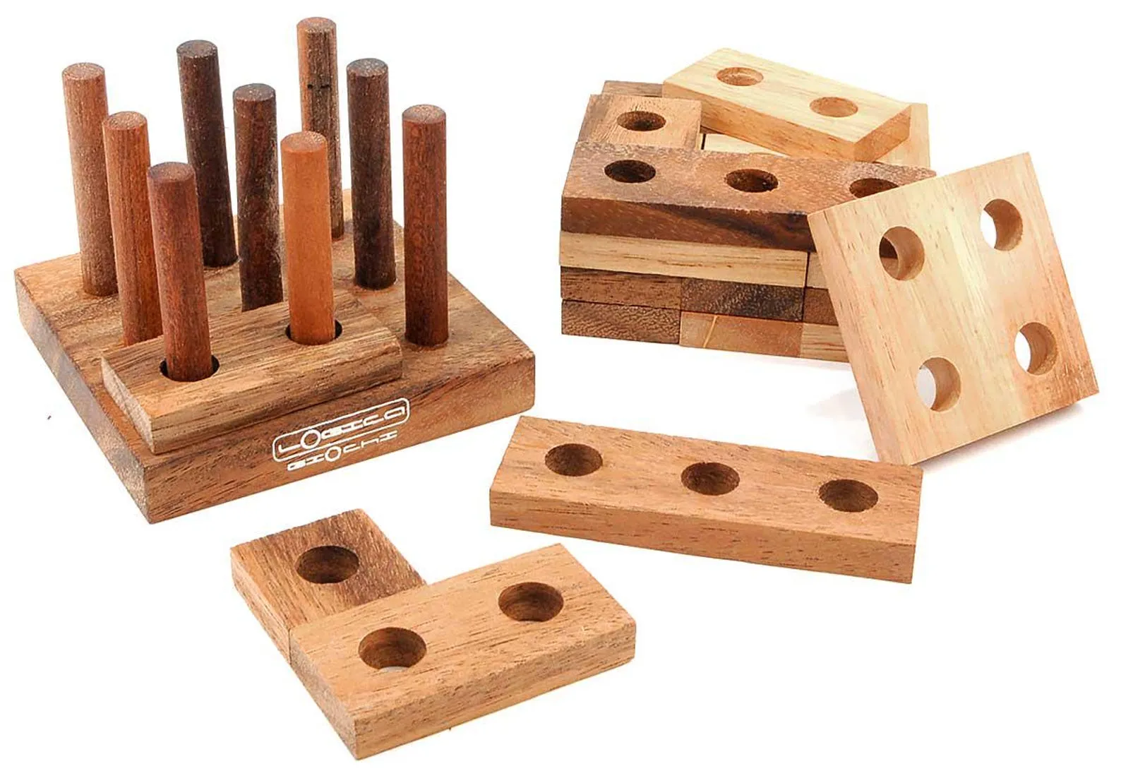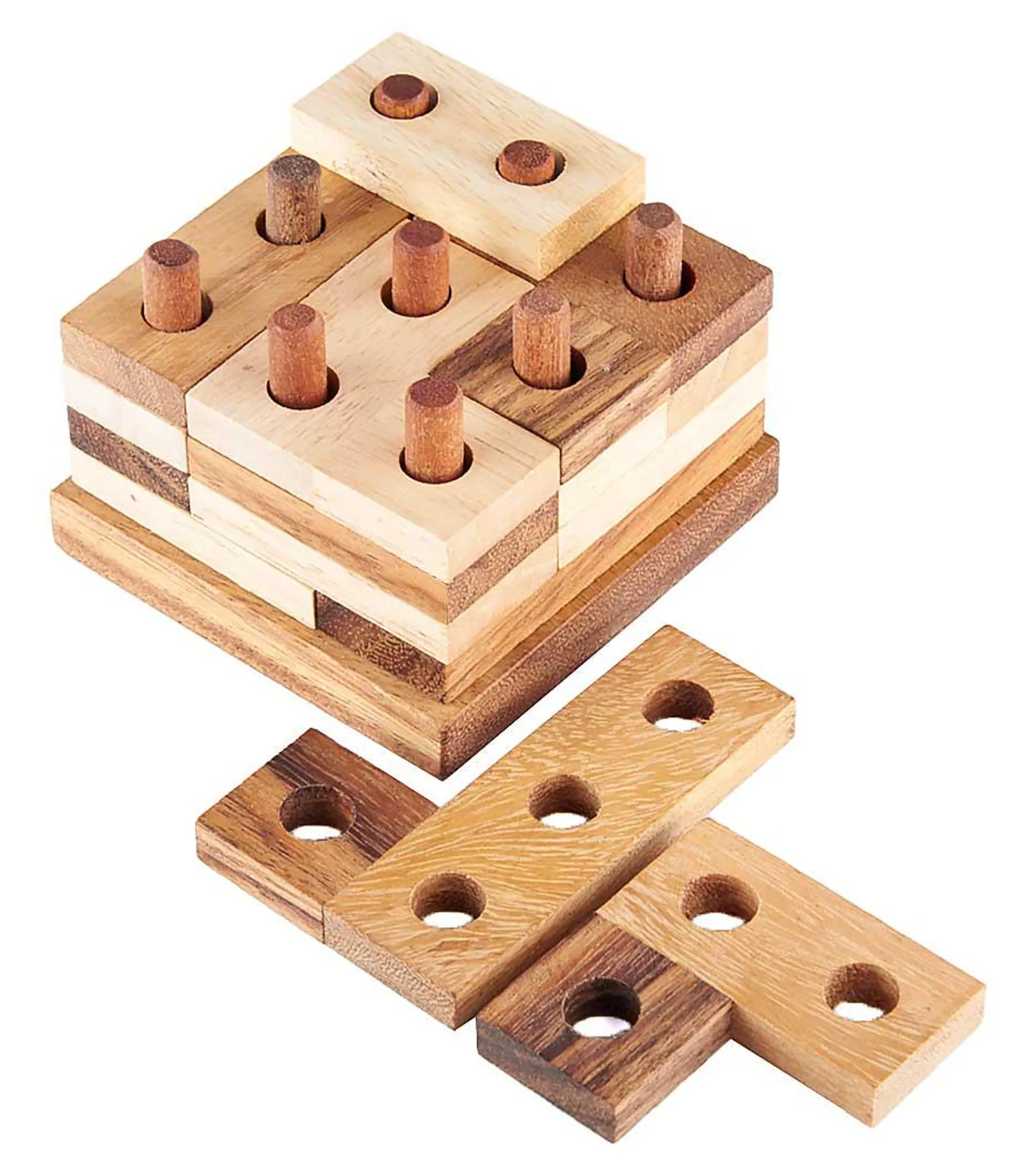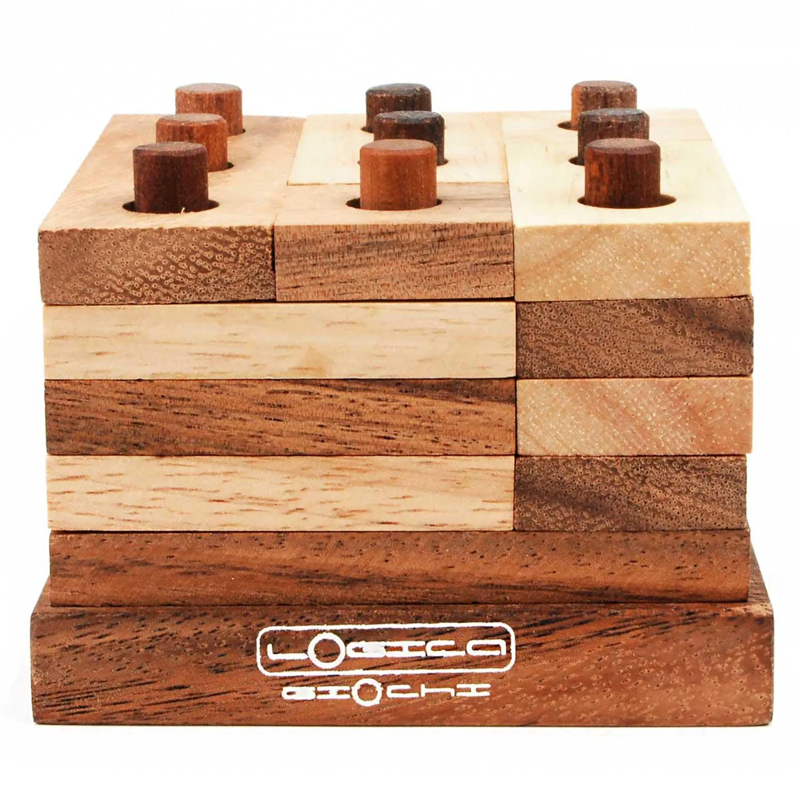 CHALLENGE: Disassemble and reassemble the tower, made up of 15 pieces: 5 layers of 3 pieces eachIncredible handcrafted puzzle in 2 different wood qualities. The 15 pieces have to be rearranged on the 9 pins and to do this there is a logic … find out!Difficulty: HARD 3/6. Average resolution time: 20 min – 30 minutes *Wood: Teak / Samena + Rubber Tree / Caoutchouc – from regenerated woods – a cut tree = a planted treeDimensions: 9 x 9 x 6.5 cm / 3.5 x 3.5 x 2.5 inchesAge: 8+PACKED IN THE LEONARDO SERIES BOXDimensions of the box of the Leonardo series: 10 x 10 x 10 cm / 4 x 4 x 4 inchesHandmade in Thailand* Average time valid for most people. Experienced, gifted, and lucky, they might solve it sooner