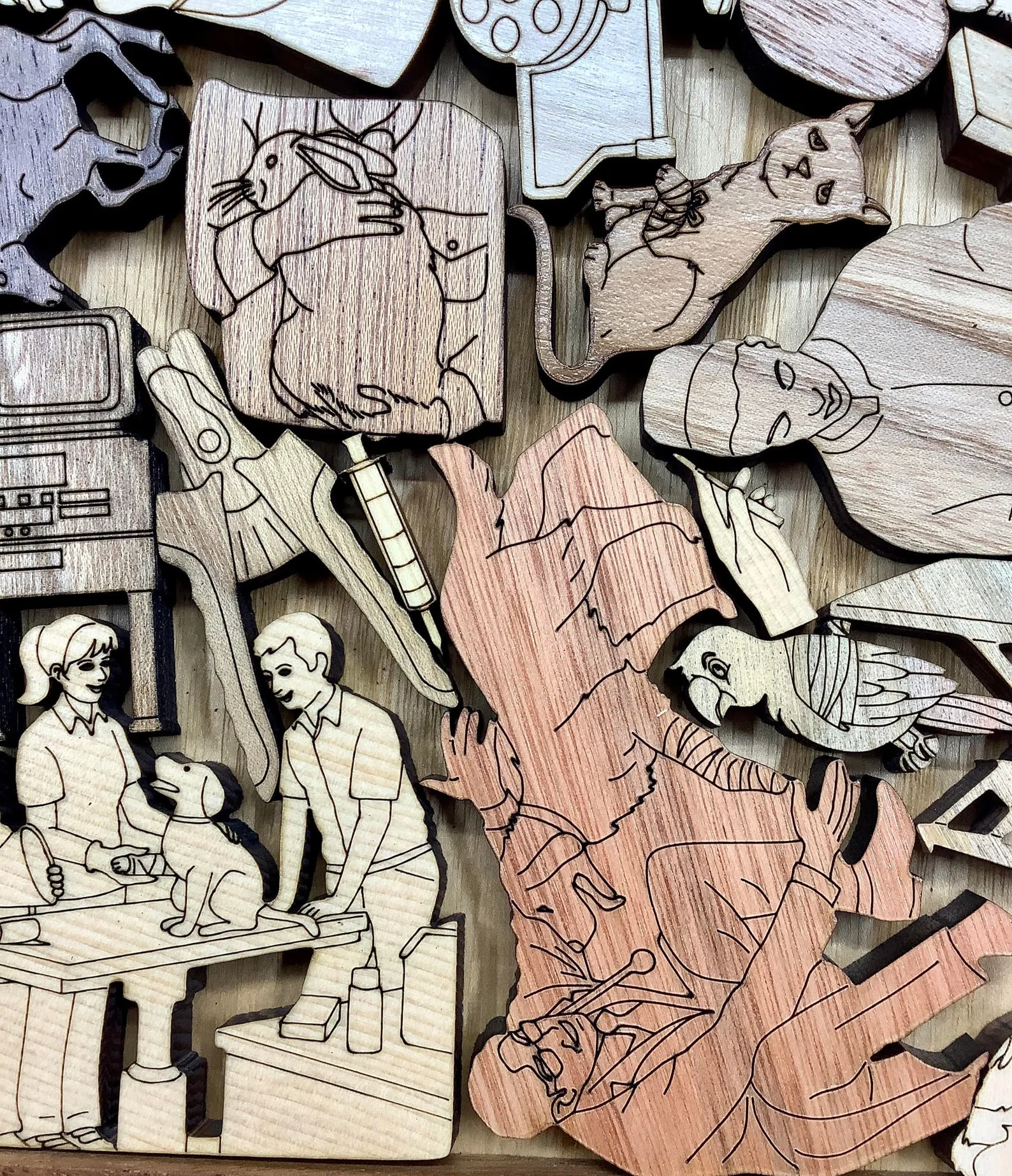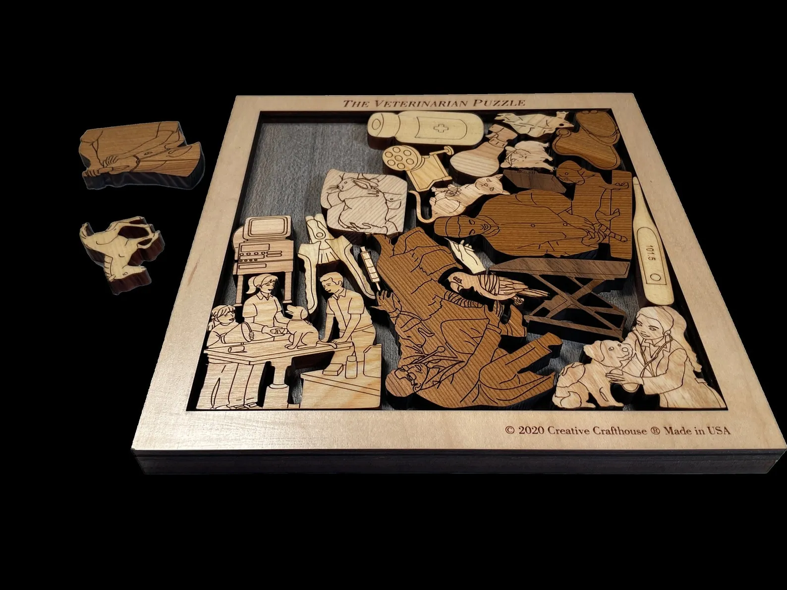 A Veterinarian Puzzle honoring this most appreciated profession. 21 precision cut laser and engraved hardwood pieces associated with animal health care must be inserted into the frame. Artistic and challenging with great detail to each piece. Quite difficult to solve! At least 5 different woods, 1/4? thick, are used. Measures about 7? square in the fame and cover. This wood animal puzzle can be personalized (choose engraving option) with text on the frame or cover for a small added fee. Typically we will put a name on the inner frame and anything longer can go on the cover.Contains small parts and is very challenging, so not recommended for young children.A Creative Crafthouse custom copyrighted 2020 design made in our Florida shop with artwork by Anjali Rami