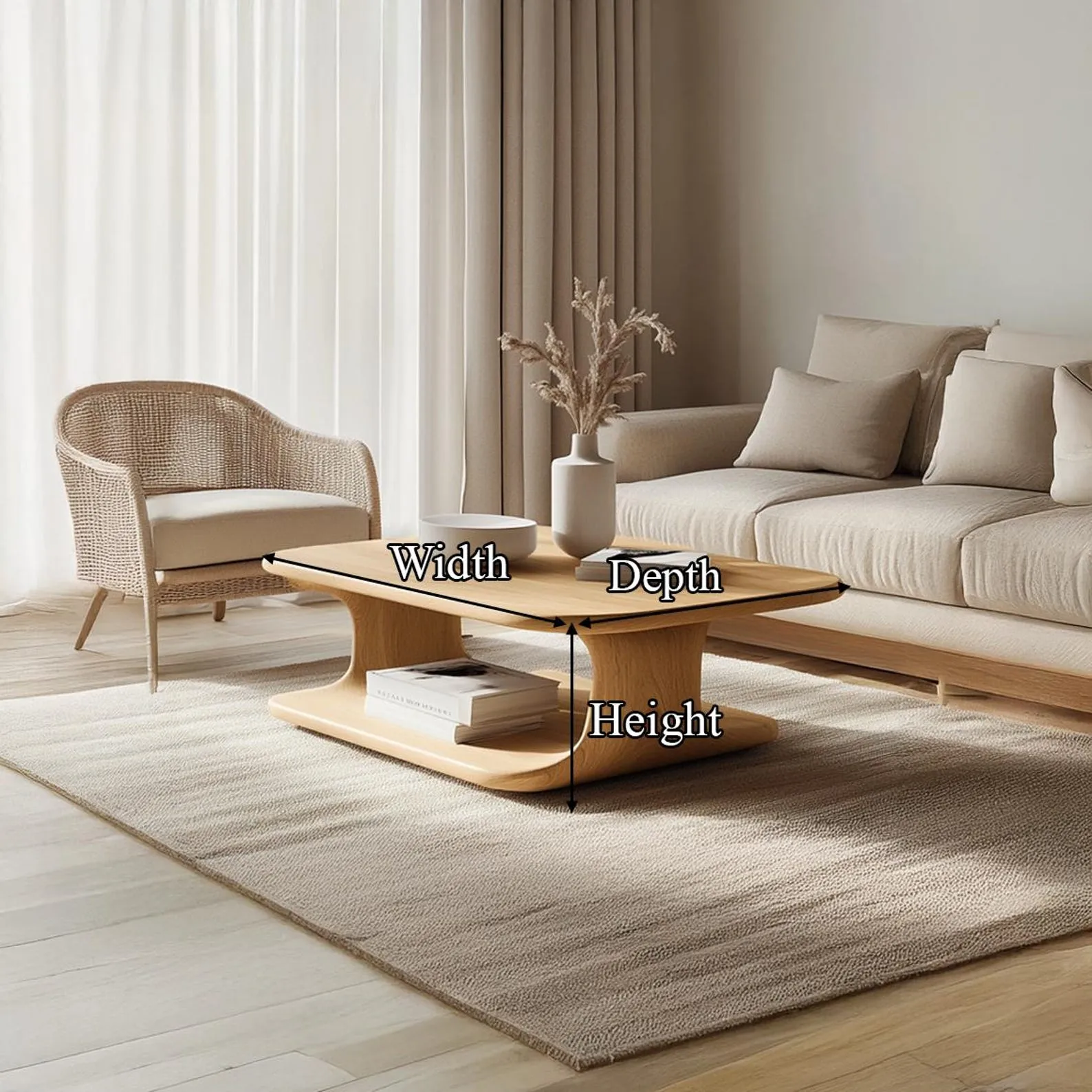 Each design is a unique creation, bearing its own distinct artistic mark. Every curve, every detail is imbued with a subtle intention, harmonizing beauty and function.Through the skillful hands of artisans, the product is carefully shaped, polished and finished from solid wood, preserving the natural wood grain and the eternal vitality of nature, to become an artistic highlight in your space.Bring natural warmth and timeless elegance into your home with this Vintage Solid Wood Coffee Table, where rustic charm meets minimalist design. Handcrafted from premium solid wood, this table features a smooth rectangular top with softly rounded corners for a gentle, child-safe finish. The tabletop is supported by two solid side panels seamlessly connected to a full lower shelf, forming a sturdy frame that offers both strength and balance. The spacious shelf beneath provides a convenient place to store books, magazines, or Decor pieces, helping you keep your living space organized in style.Features Youll Love: Handcrafted Solid Wood Premium wood with rich natural grain and warm rustic tones Child-Safe Rounded Edges Smooth corners for a soft and safe finish Integrated Side Panels Sturdy solid panels create a strong supportive frame Spacious Lower Shelf Perfect for storing books, baskets, or everyday essentials Timeless Minimalist Design Blends rustic charm with clean modern linesPerfect for Cozy Living Rooms: This coffee table combines functionality with understated beauty, making it an ideal centerpiece for minimalist or rustic-inspired living spaces.? A Thoughtful Housewarming Gift: With its handcrafted build and versatile storage, this solid wood coffee table makes a meaningful and lasting gift for anyone who appreciates quality furniture.