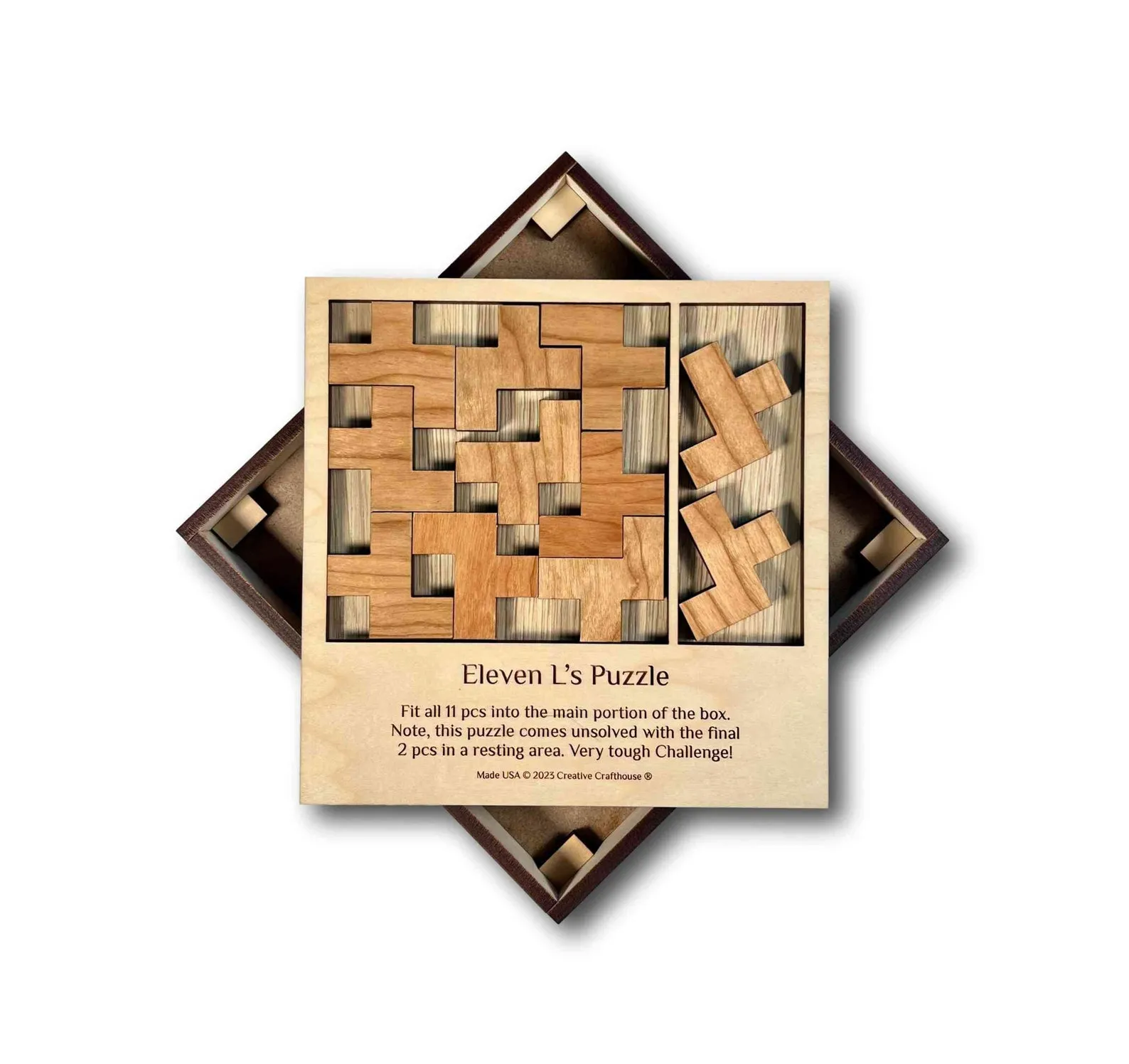 This wooden puzzle comes unsolved! Your goal is to fit all eleven of the L shaped pieces into the large opening. Fun to try but difficult to solve! A challenging puzzle which makes a wonderful gift for your favorite puzzle lover or maybe even yourself!Wooden cover included. Handmade in Hudson, Florida.