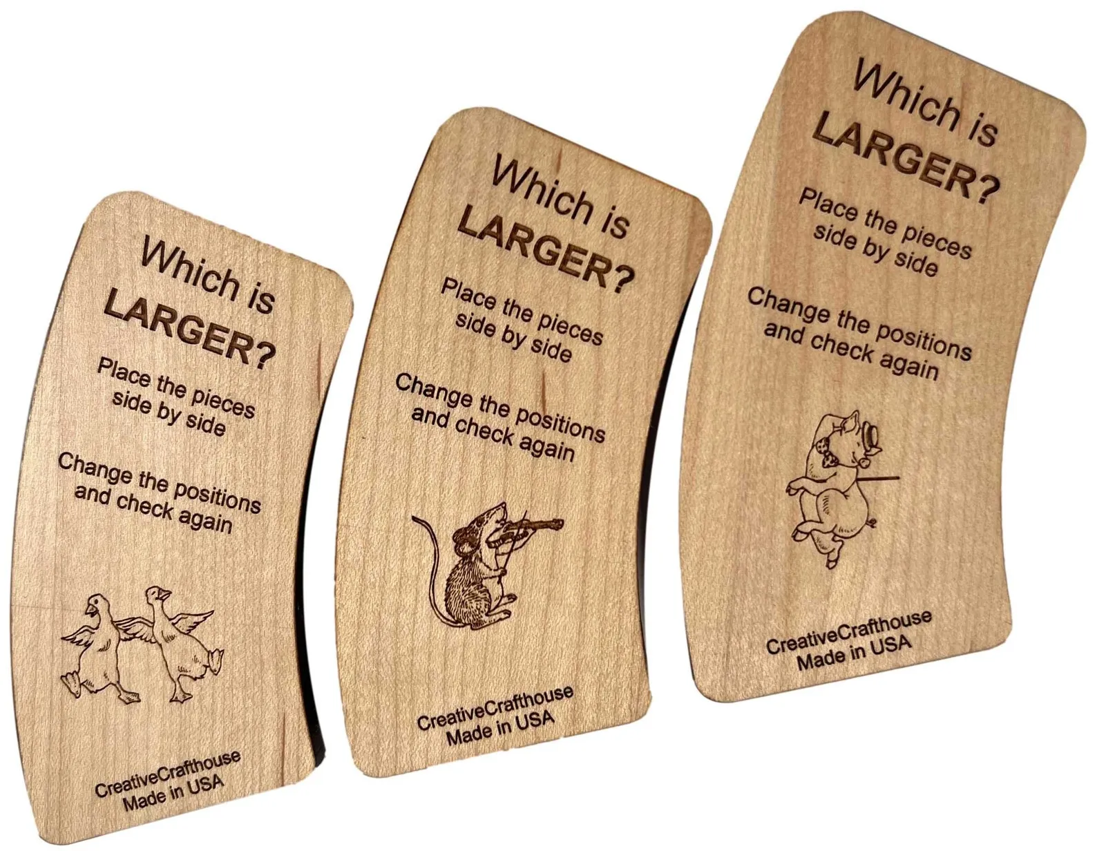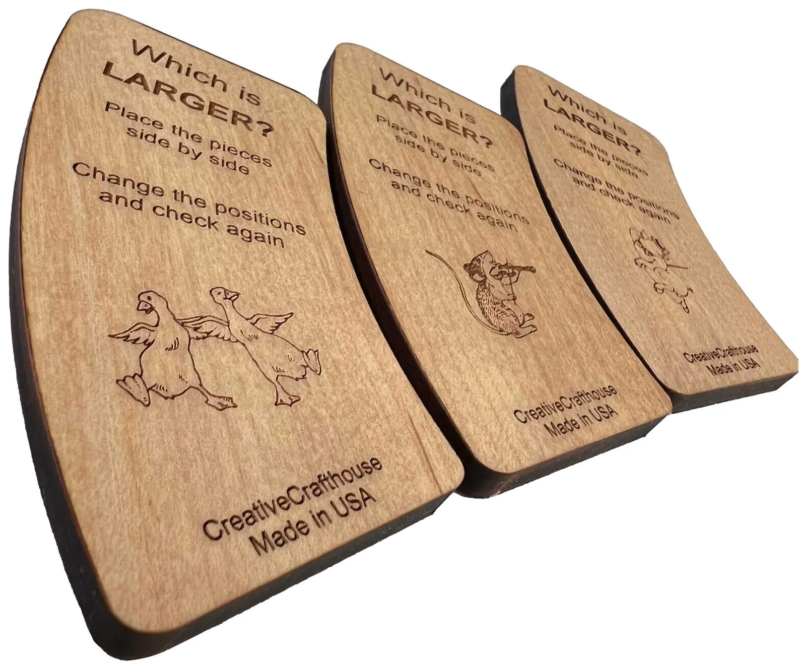 3 pieces are arranged next to each other. Can you determine which one is larger? It seems pretty easy. BUT, change the order of the pieces?. Is the one you chose still the largest? It?s a mind blowing illusion because although the pieces appear to be quite differently sized, they are actually all the same! Whichever of the pieces is on the right will appear largest. The piece on the left will appear smallest. You can probably envision the fun you might have messing with your friends and family with this one. This model is made from Maple, nicely finished and deeply laser engraved. The wood is ?? thick and cut along the grains so very strong. This model has a fiddling mouse, dancing ducks and a dancing pigs lasered on the pieces.The economy version is made from floorboard material. It is the same physical size as the premium version. It is also laser engraved. It has letters to identify the 3 pieces. It uses a single color floorboard material, though the color may change a bit depending on what I have available.This puzzle is based on a paper puzzle from the 1930?s or 40?s that I bought at auction. I had so much fun with it I had to make it?. You can see that original at the end of the video. Made in our Spring Hill Florida shop.You can view a video on this puzzle bu cutting and pasting this link:http://www.youtube.com/watch?v=EZwR8hyCYyw