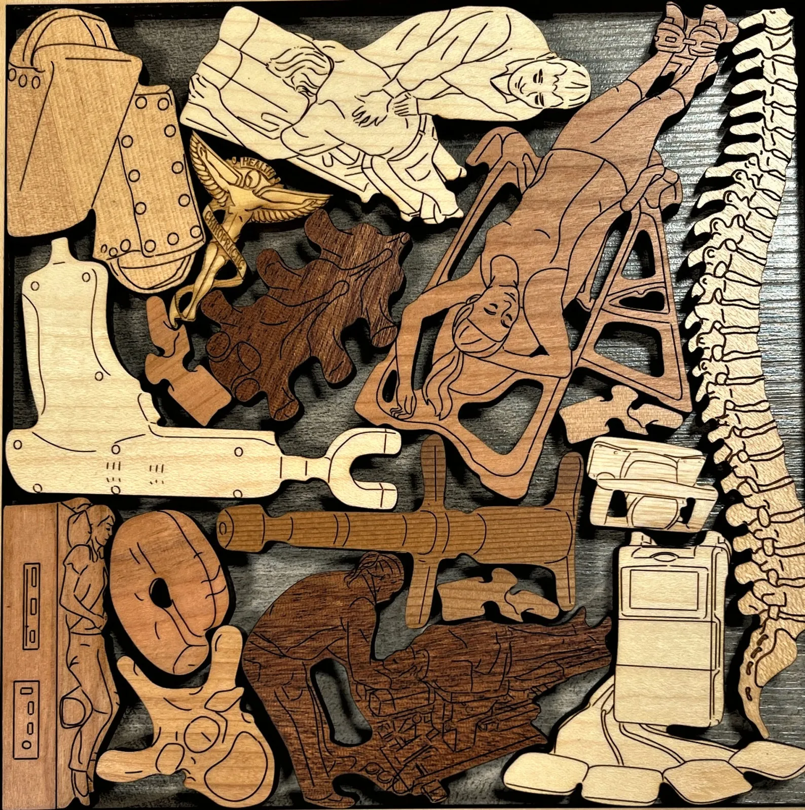 If your back hurts, I may have a solution as you could have such a headache after trying to solve this Chiropractor puzzle that you?ll forget all about your backache. Dedicated to honor Chiropractors who work with such care to improve our condition.Can you fit all the pieces into the base? An attractive, challenging, and fun puzzle.. The pieces show scenes or items associated with Chiropractic care. They are finely detailed and laser cut from ?? thick wood. There will be at least 4 different woods used in each puzzle. Each puzzle will be a little different as we will mix up the woods. Pieces include Spine and Bones, Adjustment Tools, Hand Held Electric Massager, Face Cradle, Traction Table, Tens Machine, Hand Held Electric Massager, Inversion Table, and Doctors making adjustments.This puzzle can be personalized (choose the engraving option) with a name or short message on the inner frame or on the cover. Might make a great gift for your doctor.Original artwork by Alexandra Plummer. Measures about 7.5 inches square in the base with cover. Made in our Hudson, FL shop. Not intended for children under 8 as it has small pieces and it is also very difficult to solve. Comes with a written solution.? 2016 Creative Crafthouse ?cut and paste this link to watch video:https://youtu.be/j3eH-8PPtWM