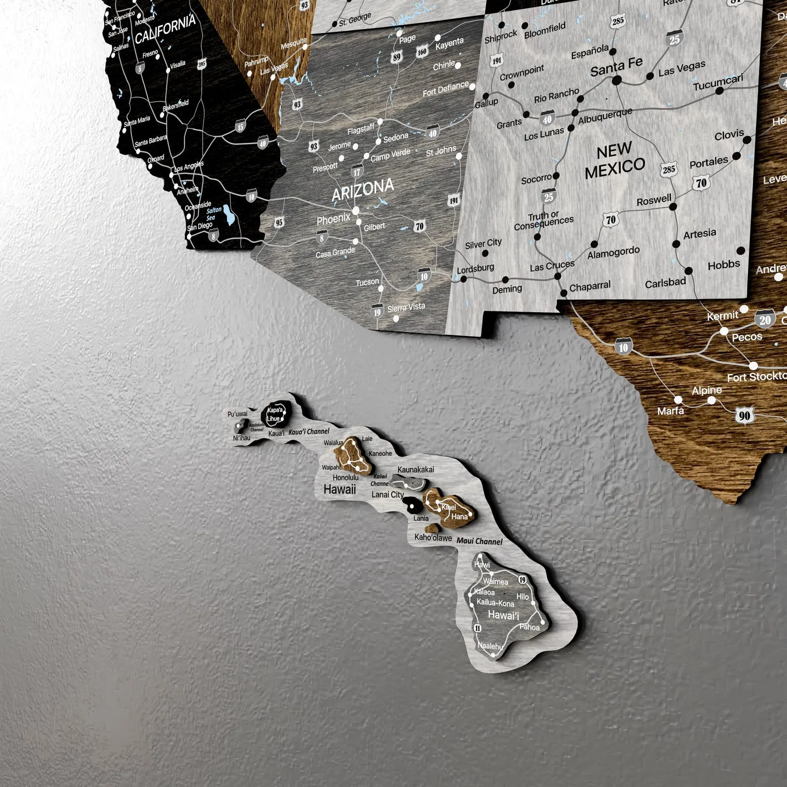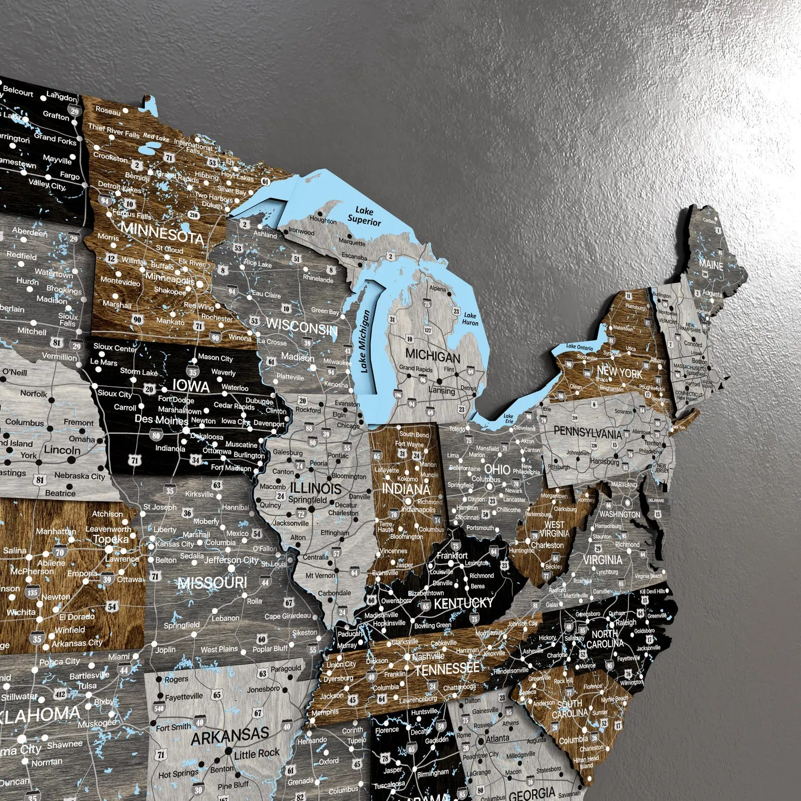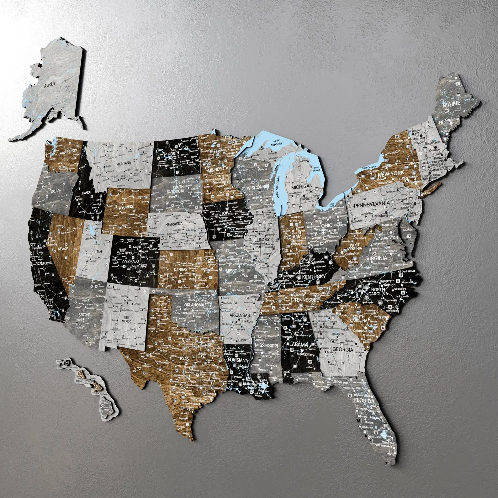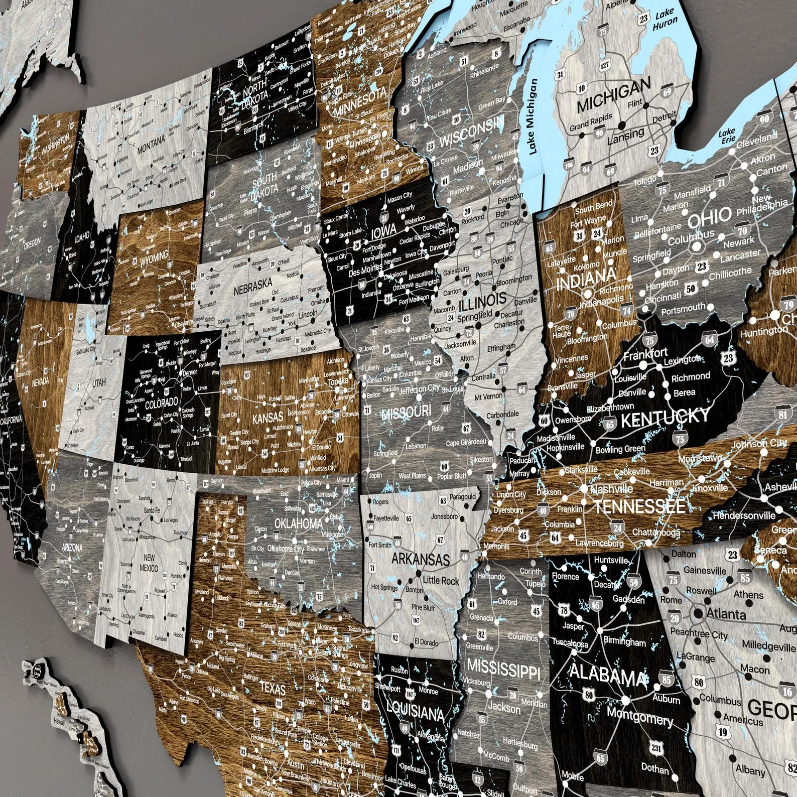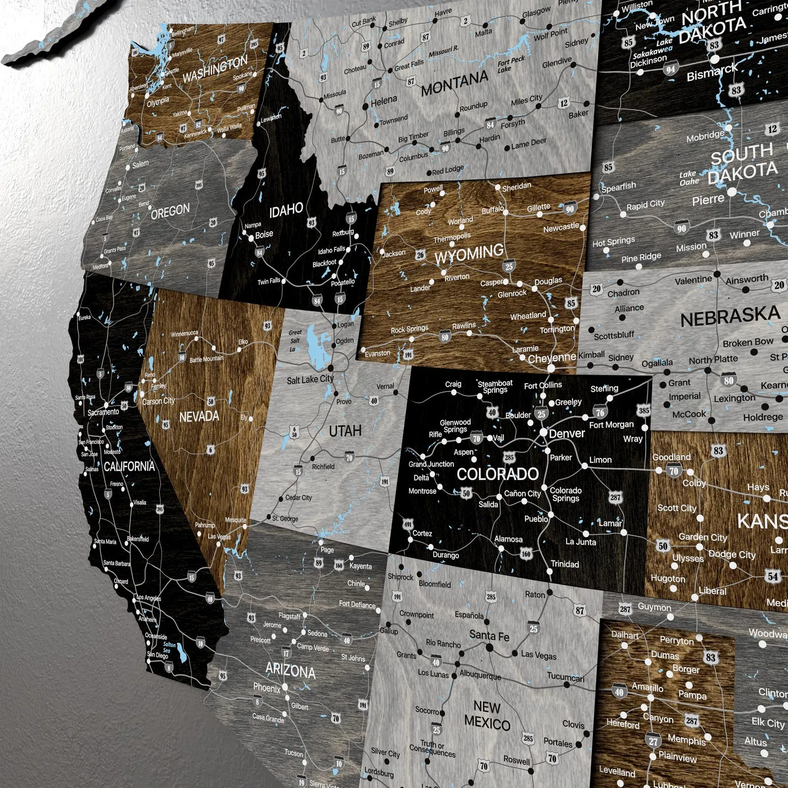 Celebrate your travels across the United States with our Wooden US Map, a beautiful combination of design and functionality. This map is the perfect addition to your home or office decor, offering a stylish and interactive way to track your adventures. With detailed prints showcasing rivers, roads, and state borders, this map is ideal for those who love to explore the beauty of the USA. It’s also an excellent choice for a housewarming Gift, anniversary present, or push-pin travel map.
