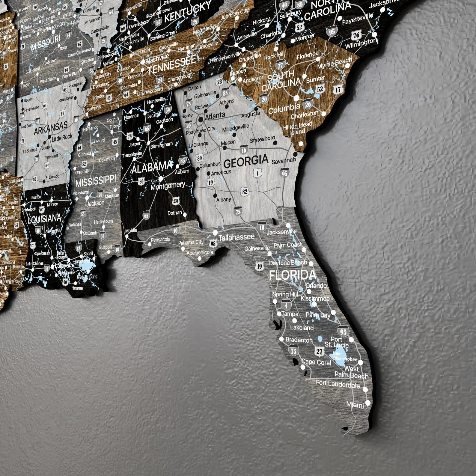 Crafted from the finest birch plywood, our USA map is finished with premium oil from Osmo (Germany) and printed with Nazdar UF Ink (USA), ensuring durability and detail. The map features colored inscriptions marking state names, natural landmarks, and more. It?s not just decor?it’s a visual representation of your travels. You can customize the map further with push pin state flags or transport pins to mark each place you’ve visited.