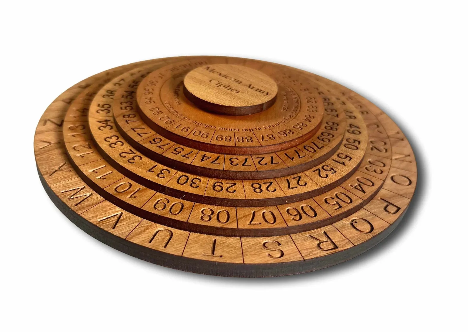 This encryption machine was state of the art during the time of conflict between Mexico and the USA shortly before World War I. It uses 5 disks that convert letters into 2 digit numbers based on a key that is used to initially set the wheels. Our version is particularly nice. The wood used is alder and the numbers are deeply laser engraved on the smooth lacquered surface. The largest wheel is just under 6? in diameter and ?? thick. The remaining wheels are either 5/32? or 1/8? thick. The machine is easy to use and comes with clear instructions. The video will also show you how to use it. We also provide 3 different encoded messages for you to try and decode.To view a video of the item, cut and paste this link:https://www.youtube.com/watch?v=8gv37aTo9Fs