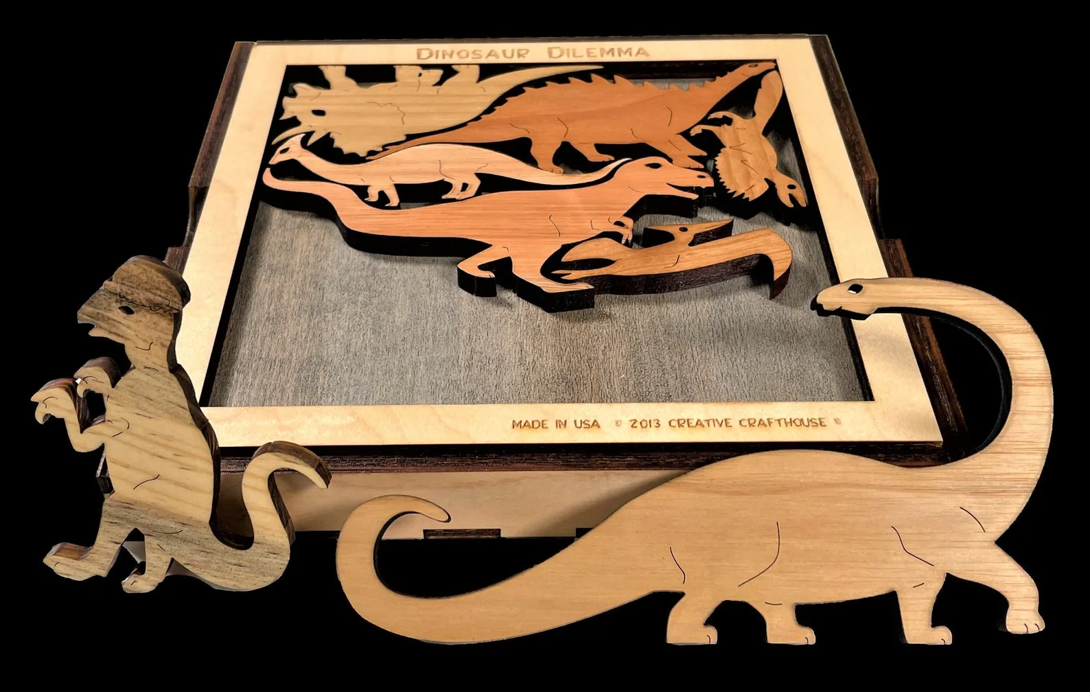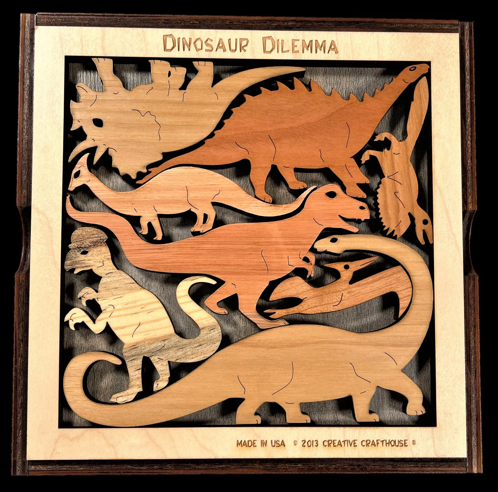 A Creative Crafthouse original design following up on the success of Sea Creatures and Zookeeper. Artistic and challenging. This may be the most difficult of the series. There are 8 dinosaurs that must fit into the square space. If you never saw it solved, 30 minutes would be a good solution time.The dino creatures are approx 1/4″ thick and there will be at least 4 different woods used. The woods will vary in each puzzle. There may be oak, cherry, maple, mahogany, alder, teak, or some other exotics as I run across them.Puzzle measures 7″ square in the base and comes with a cover. It can be personalized (choose engraving option) with a name or short phrase.Please copy and paste the link below to see a video on this fun wood puzzle:http://vzaar.tv/876632