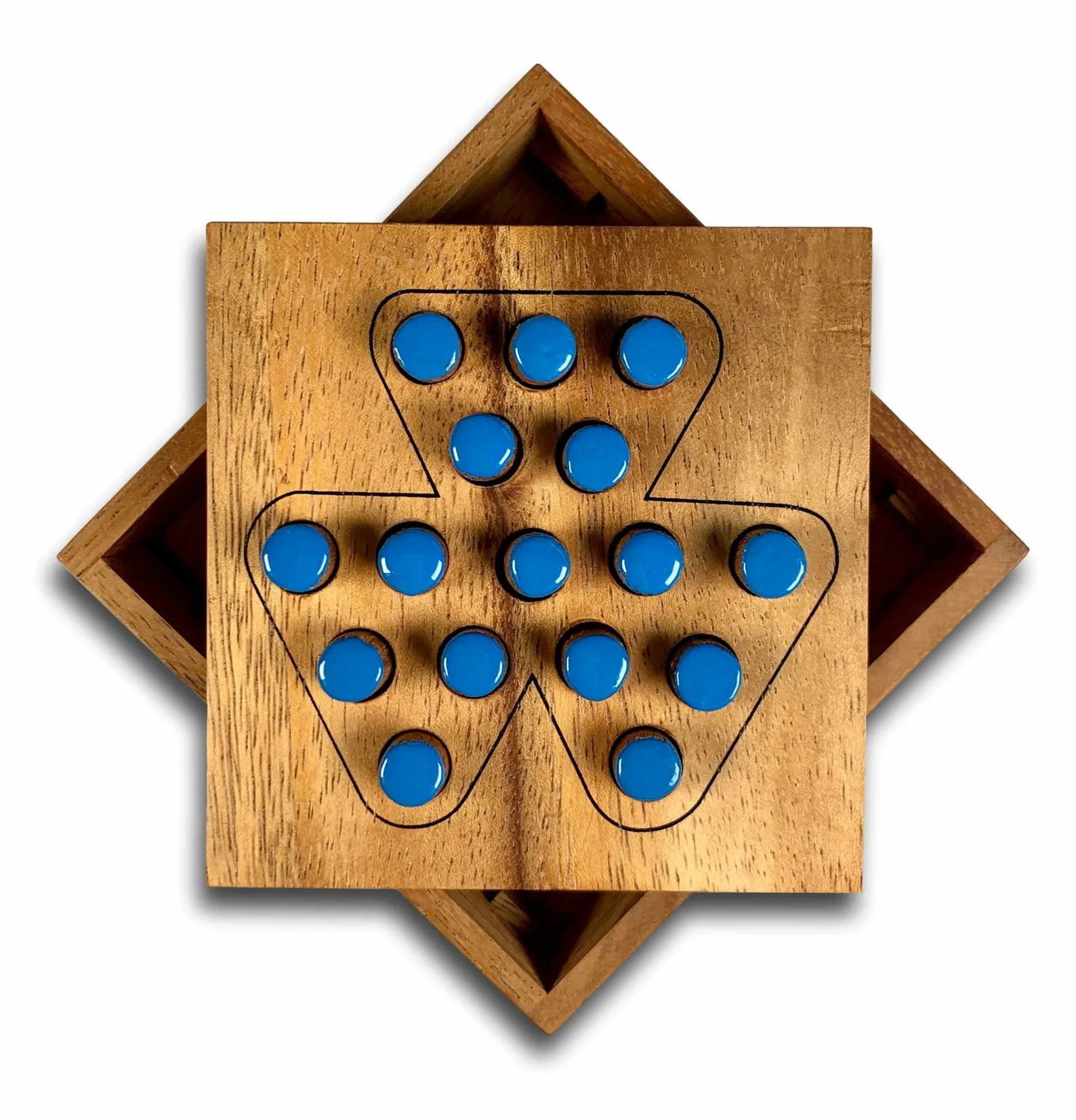 This is a peg jumping game first patented in 1891 by American Herbert Smith. Select a peg and jump over an adjacent peg to a vacant hole. Remove the peg that was jumped. Repeat this process trying to end up with 1 peg. The is a bit more difficult version of our triangle shaped Last Fighter puzzle. Beautifully made from Raintree hardwood. Comes with cover and solution is included.Level of Difficulty: Level 3