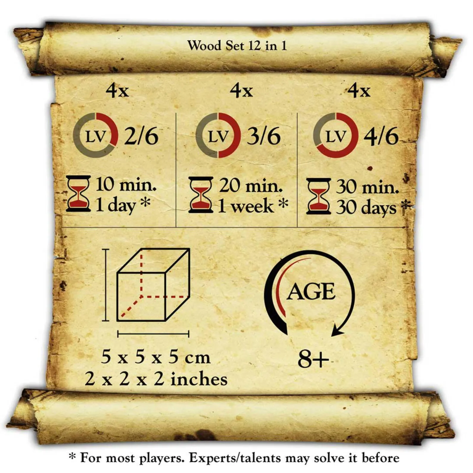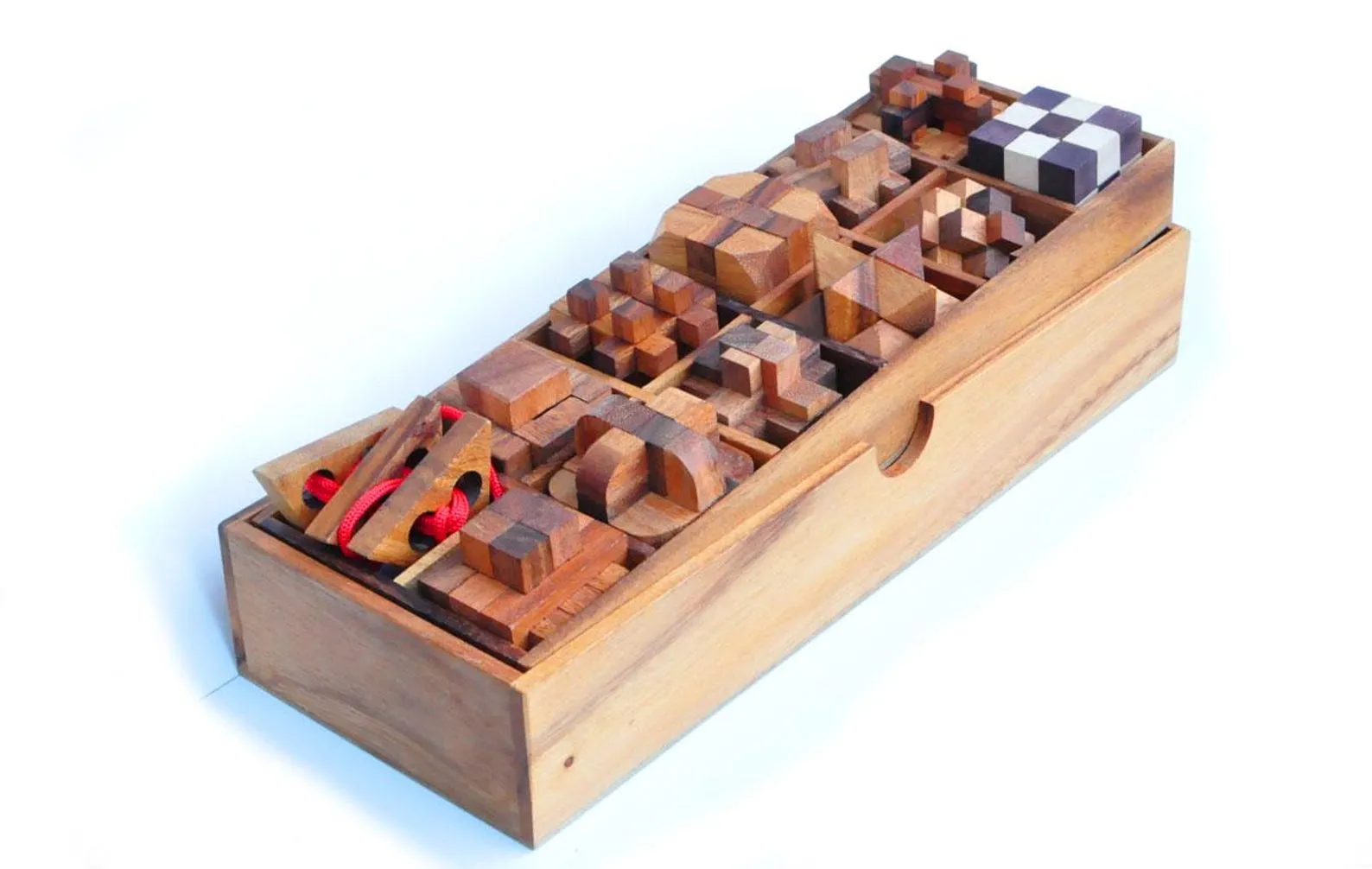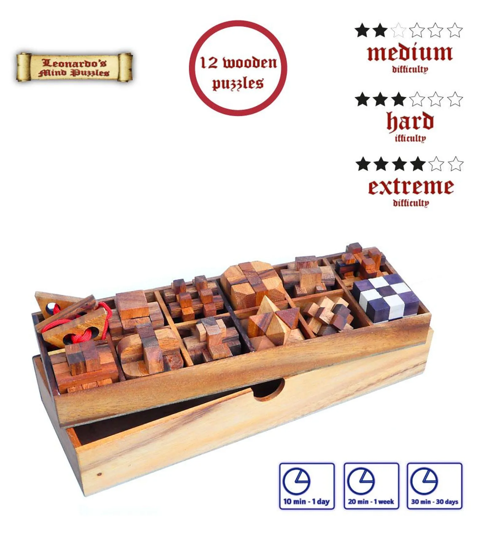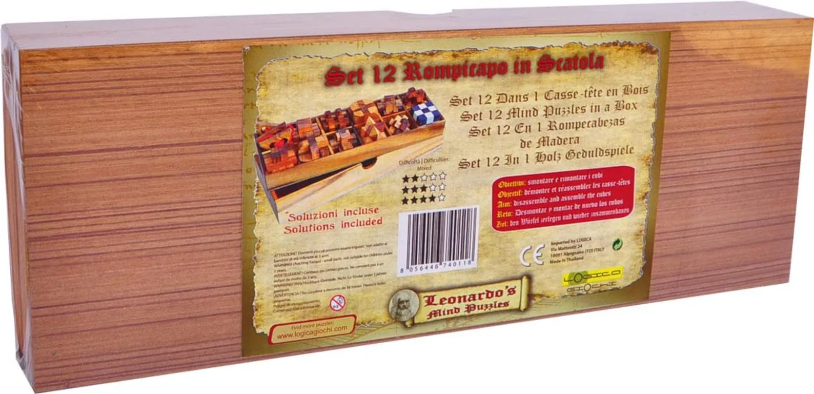 WOODEN SET 12 IN 1 BOX.Marvellous Set of 12 wooden brain teasers in 1 box. Great for gift or for personal collection.Special Wooden box in Teak wood and Bamboo lid.CHALLENGE: disassemble and assemble again the cubes. 12 different cubes of different difficulties.Difficulties:4 x MEDIUM 2/6. Average solution time: 10 min. – 1 day.4 x HARD 3/6. Average solution time: 20 min. – 1 week.4 x EXTREME 4/6. Average solution time: 30 min. – 30 days.Wood: Teak/SamenaBox dimensions: 36,6 x 13 x 8 cm / 14.4 x 5.1 x 3.1 inches.Puzzles dimensions: 5 x 5 x 5 cm / 2 x 2 x 2 inches.Handmade in Thailand.PACKAGING: SHRINK WRAPPED WITH COLORED STICKER. SOLUTIONS INCLUDED