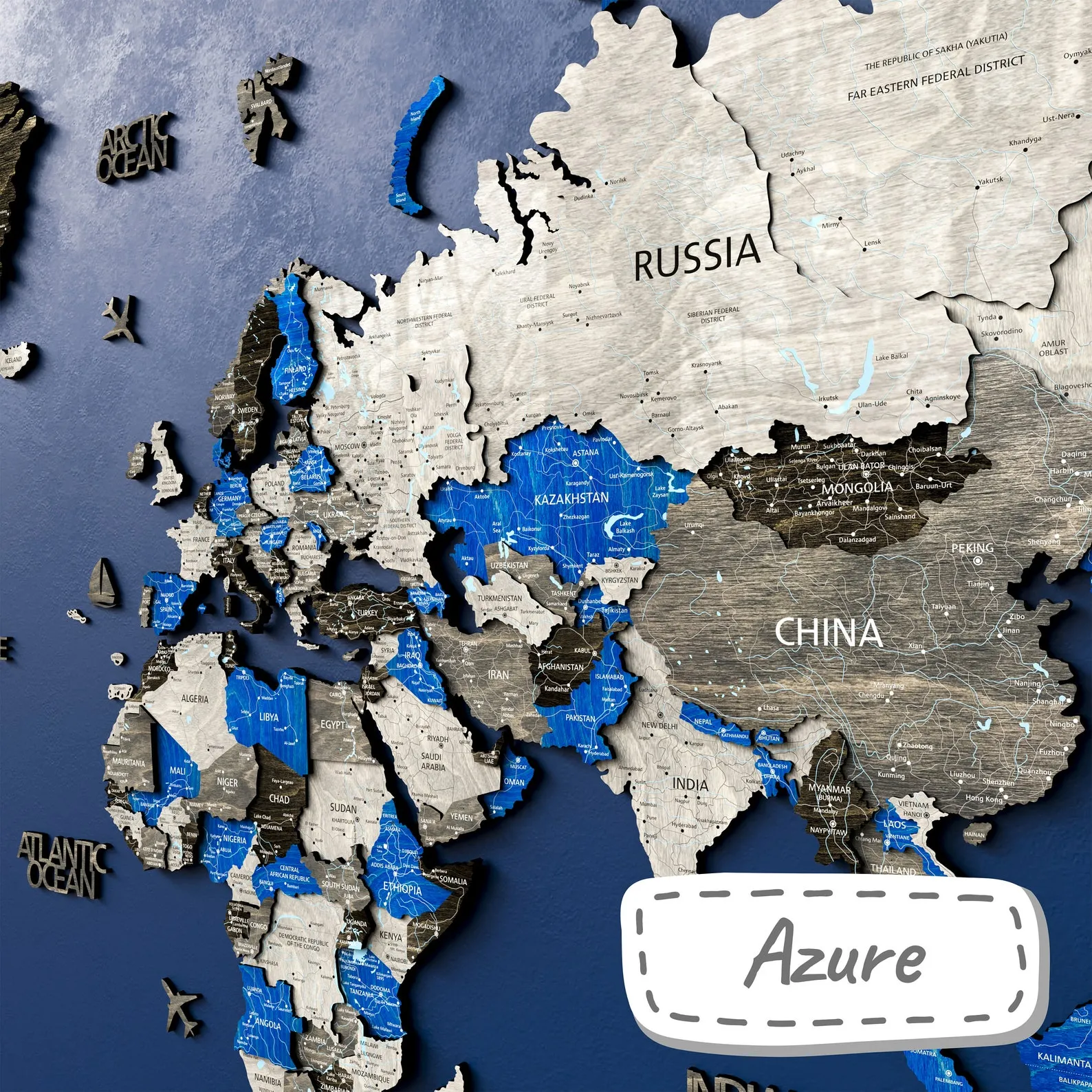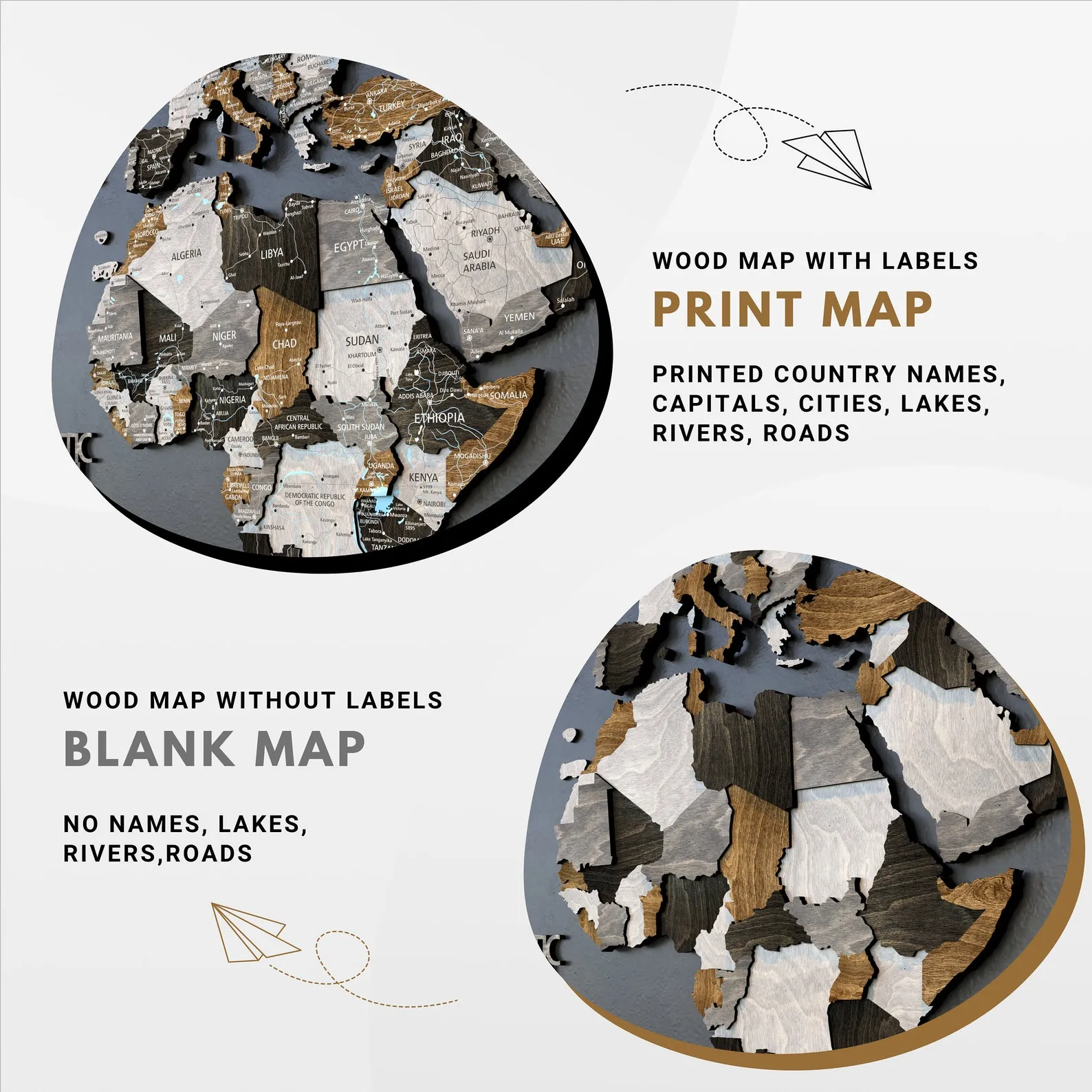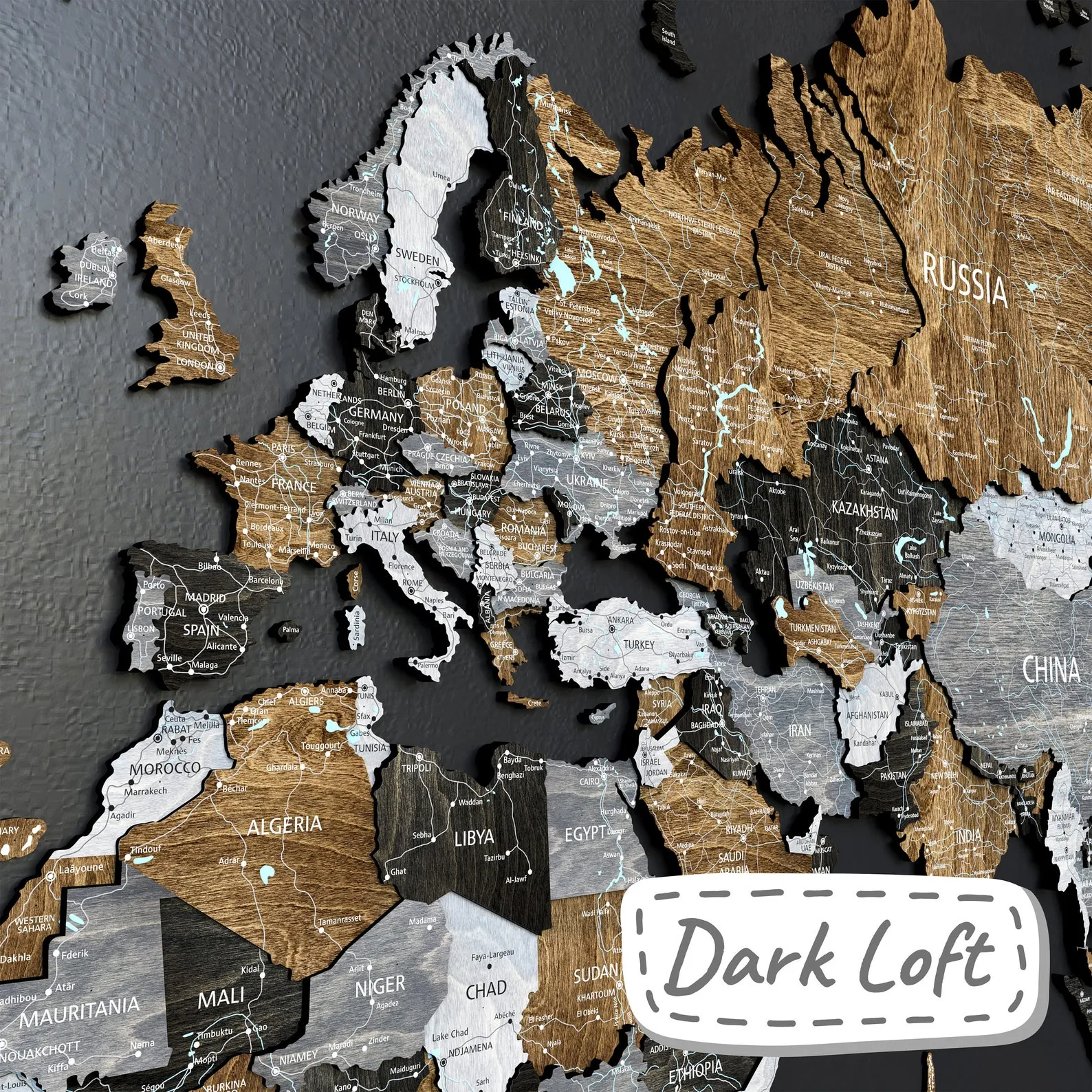 ? Print Map – unique wooden world map with printed inscriptions of countries, capitals, cities, rivers and lakes, roads