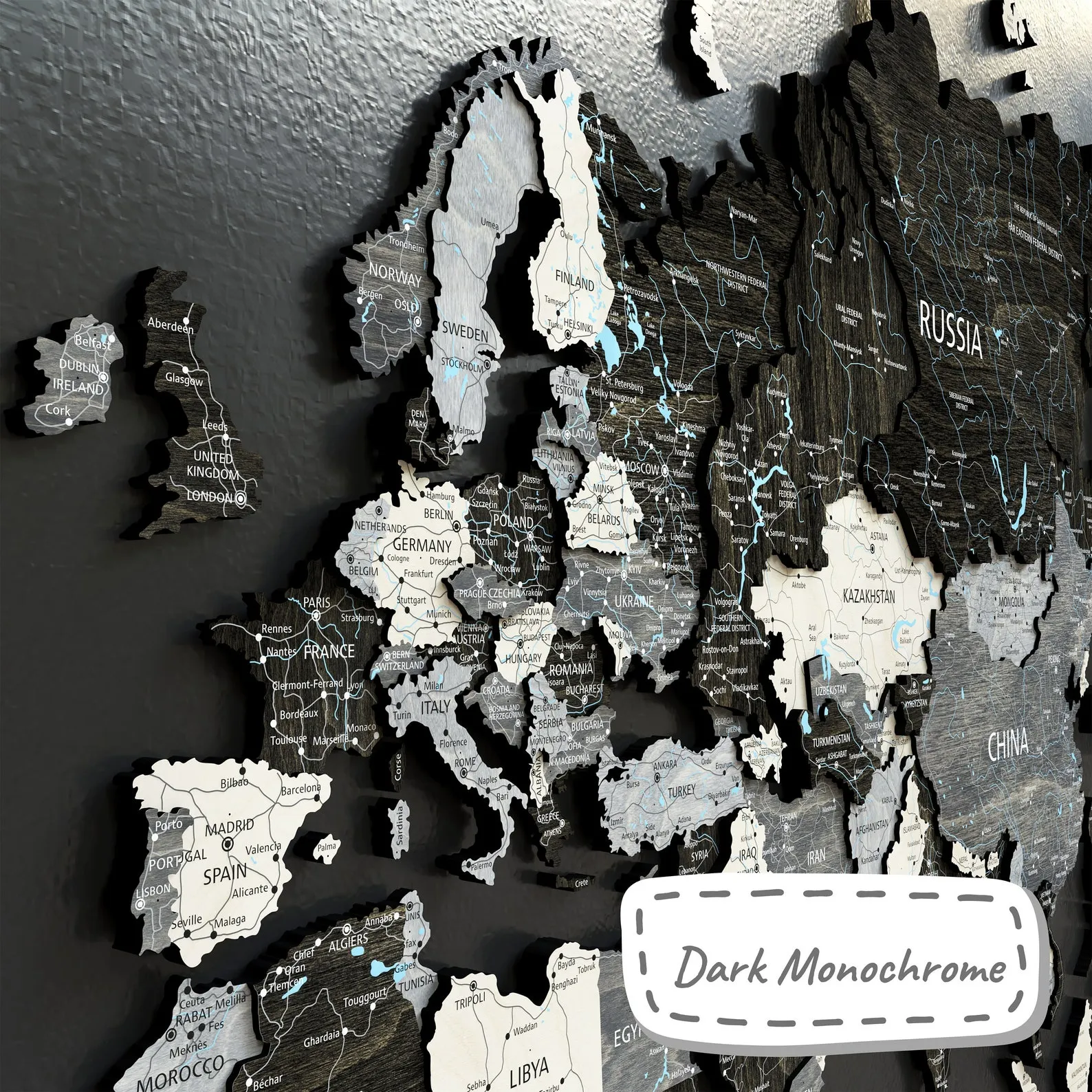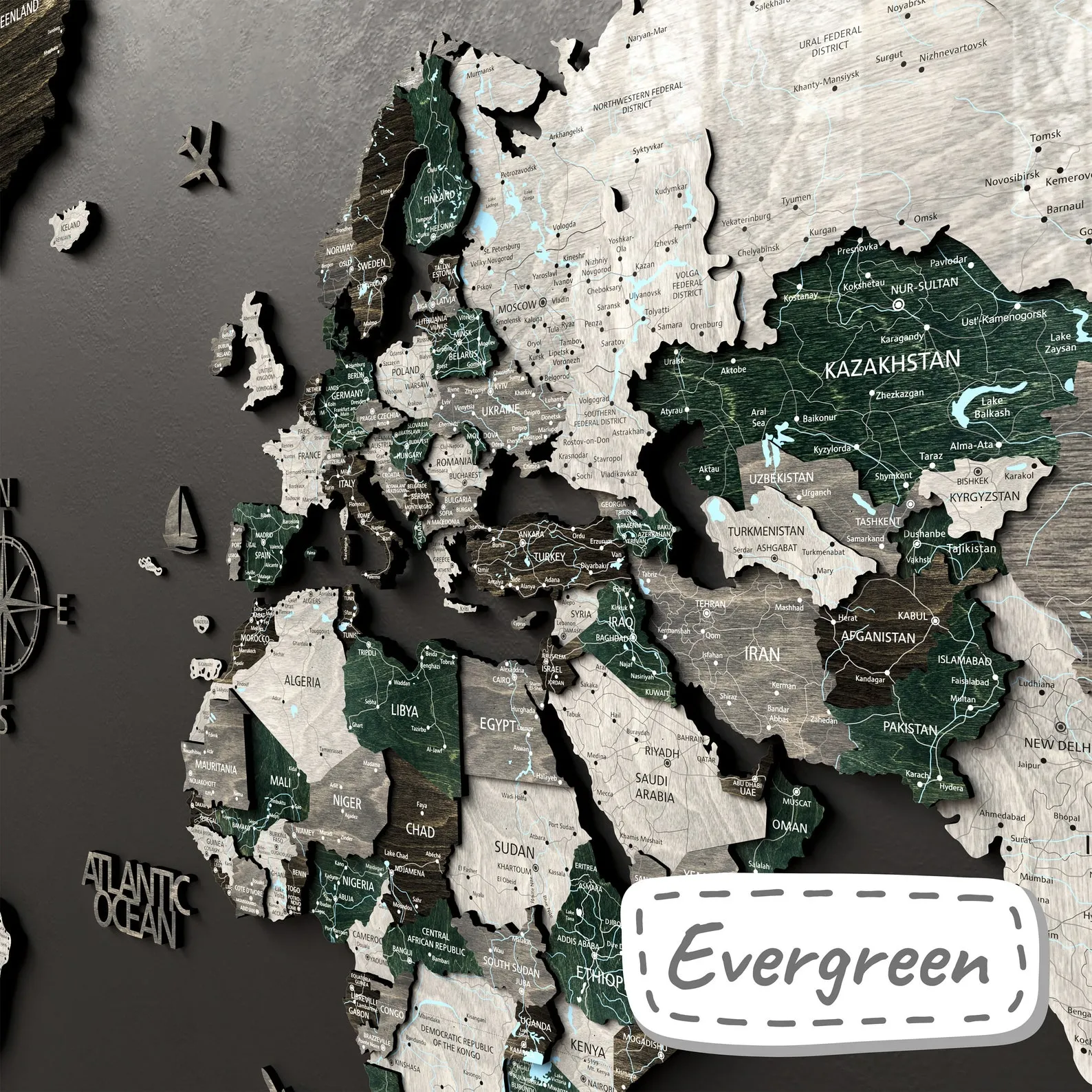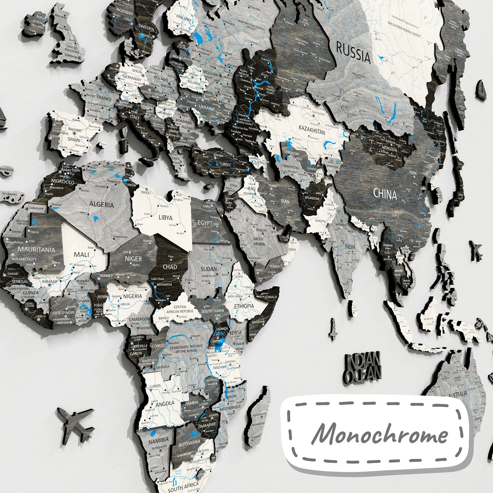 ? Print Map – unique wooden world map with printed inscriptions of countries, capitals, cities, rivers and lakes, roads