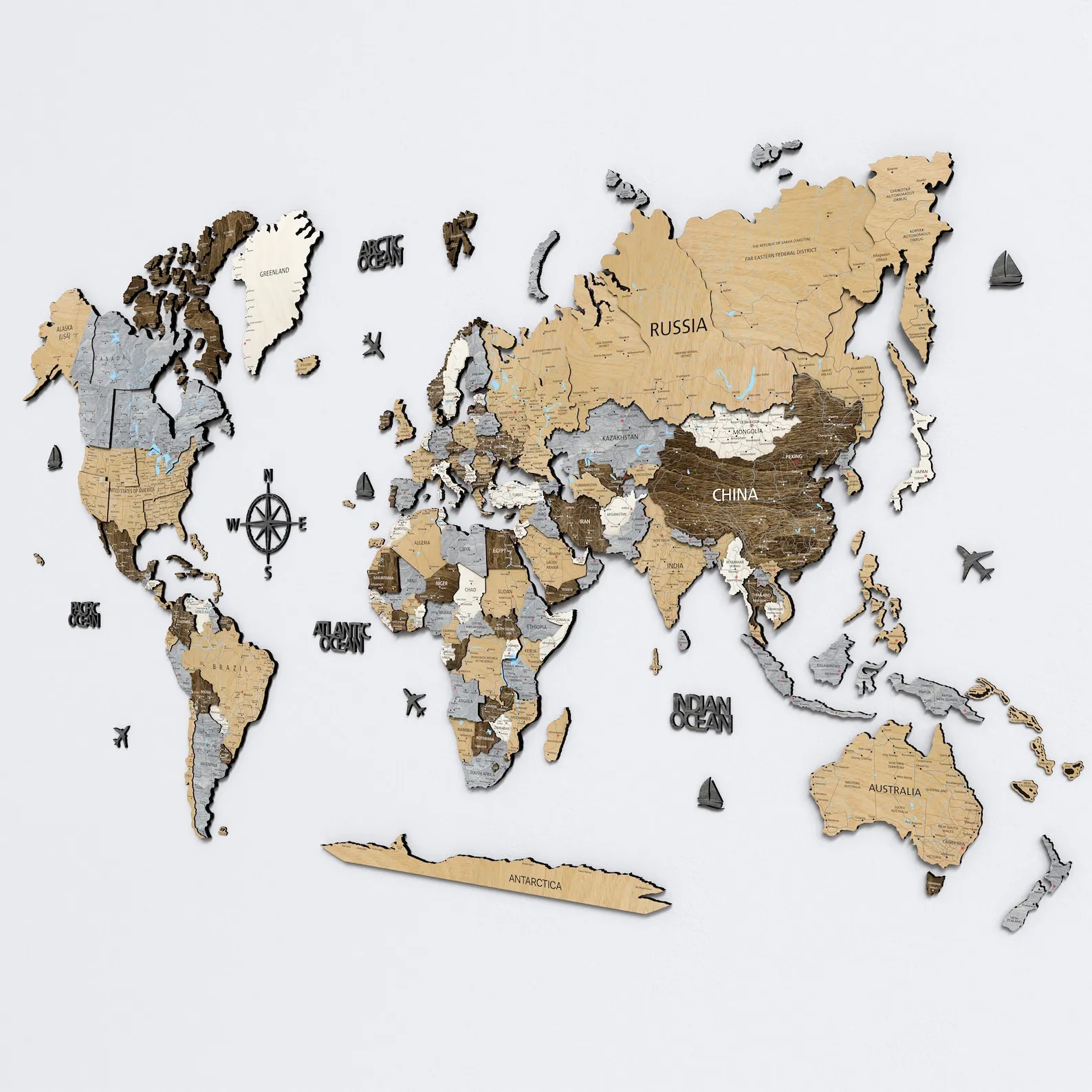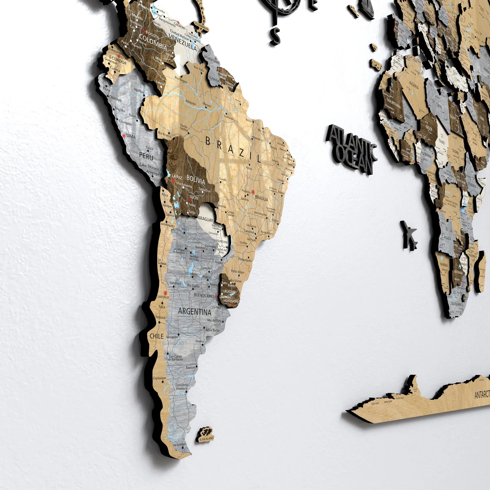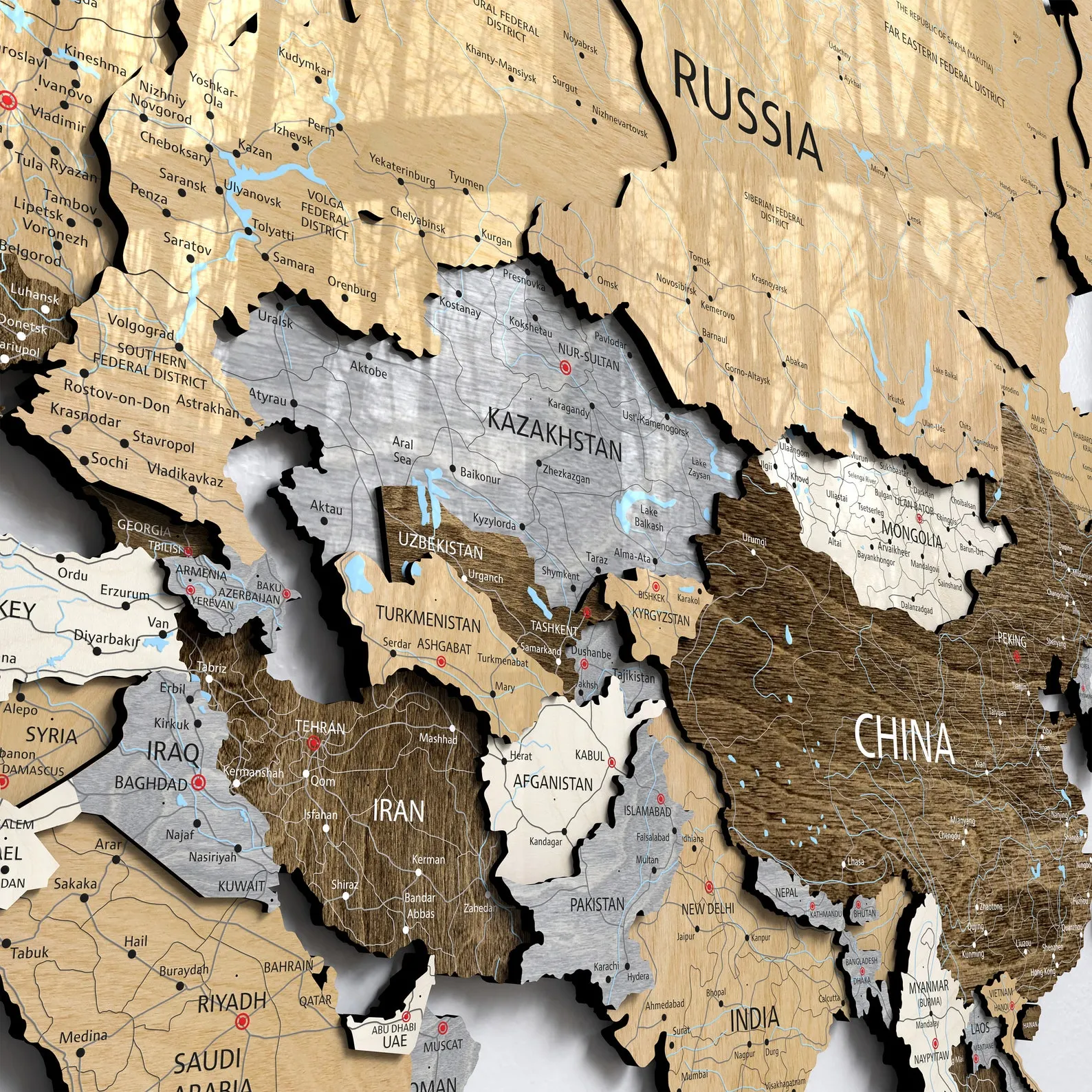 ? Print Map – wooden world map with printed inscriptions of countries, capitals, cities, rivers and lakes, roads