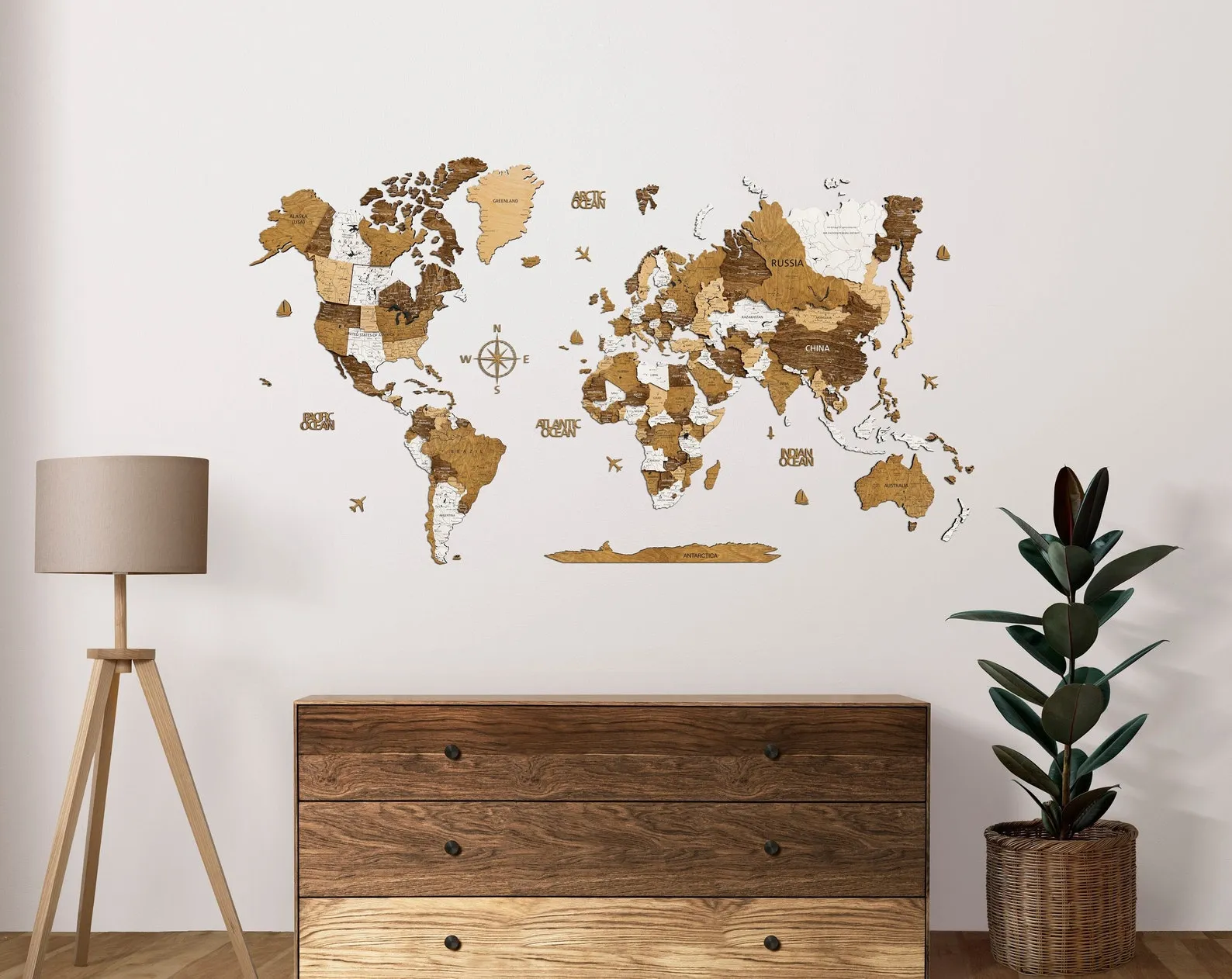 Our wooden wall map is multi-layered, giving it a remarkable 3D effect. Each piece is carefully covered with wood wax oil for protection and longevity, and then topped with a high-quality print that includes the names of countries, capitals, and numerous cities, as well as rivers and lakes. This ensures a beautiful and durable finish that is both informative and decorative.
